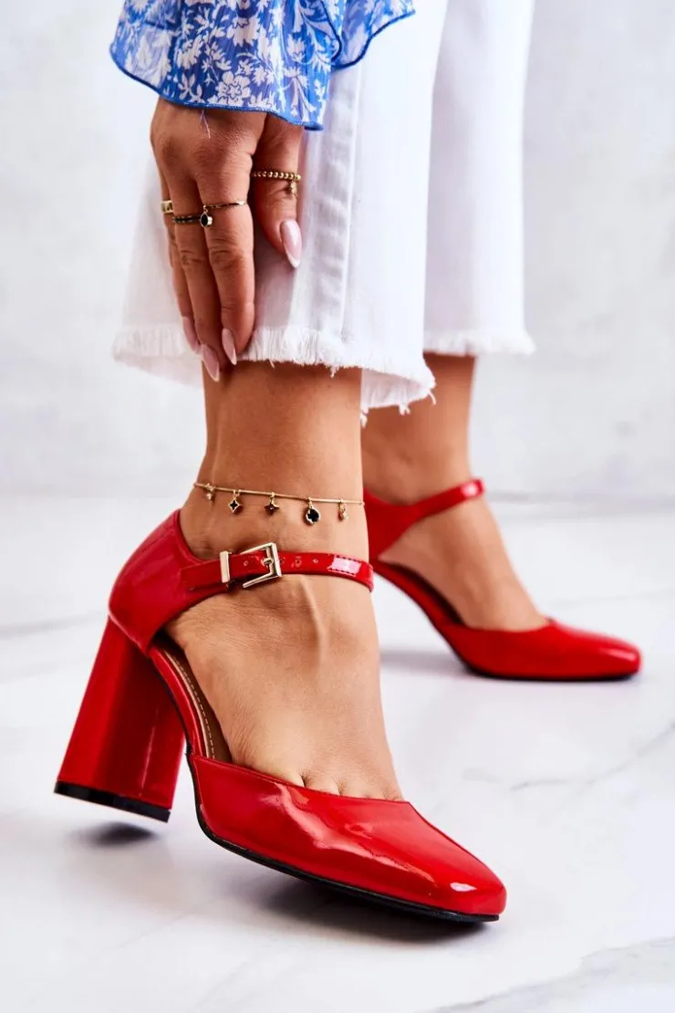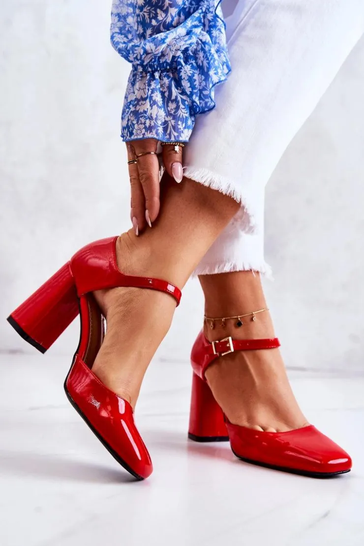 Klasyczne czółenka wykonane z lakierowanej eko skóry. Pięknie prezentują się na nodze. Obcas w postaci stabilnego słupka. Zapinane wokół kostki na regulowany pasek ze sprzączką. Nosek zakryty, kwadratowy. Miękka, wykonana z eko skóry wkładka zapewni komfort na każdym kroku. Modne i stylowe czółenka doskonale będą komponować się z eleganckimi, szerokimi spodniami czy z sukienką o fasonie marynarki. Uniwersalność, elegancja i wygoda – te cechy idealnie określają ten model czółenek! Przy wyborze rozmiaru prosimy kierować się tabelą rozmiarów