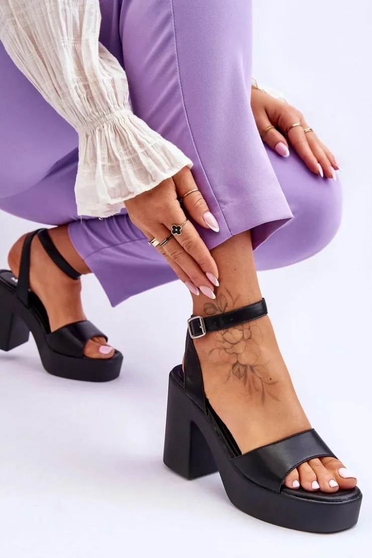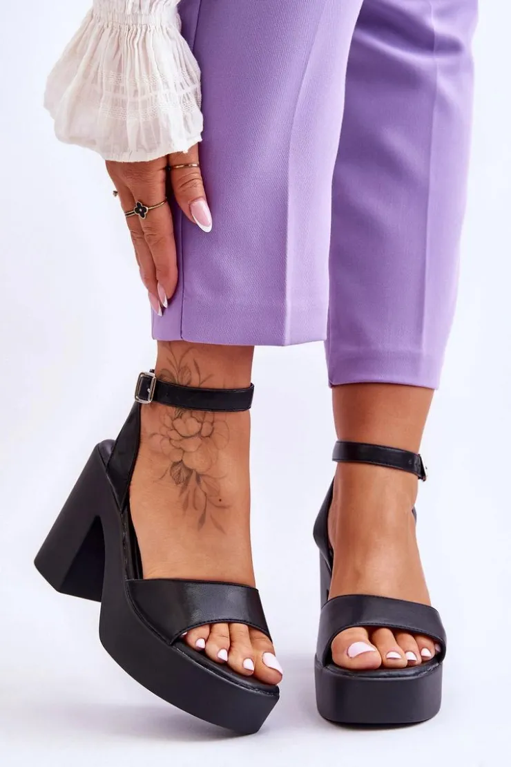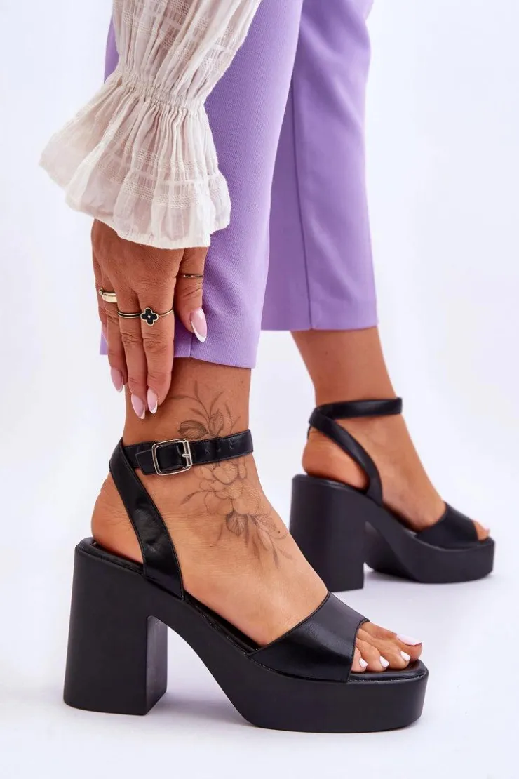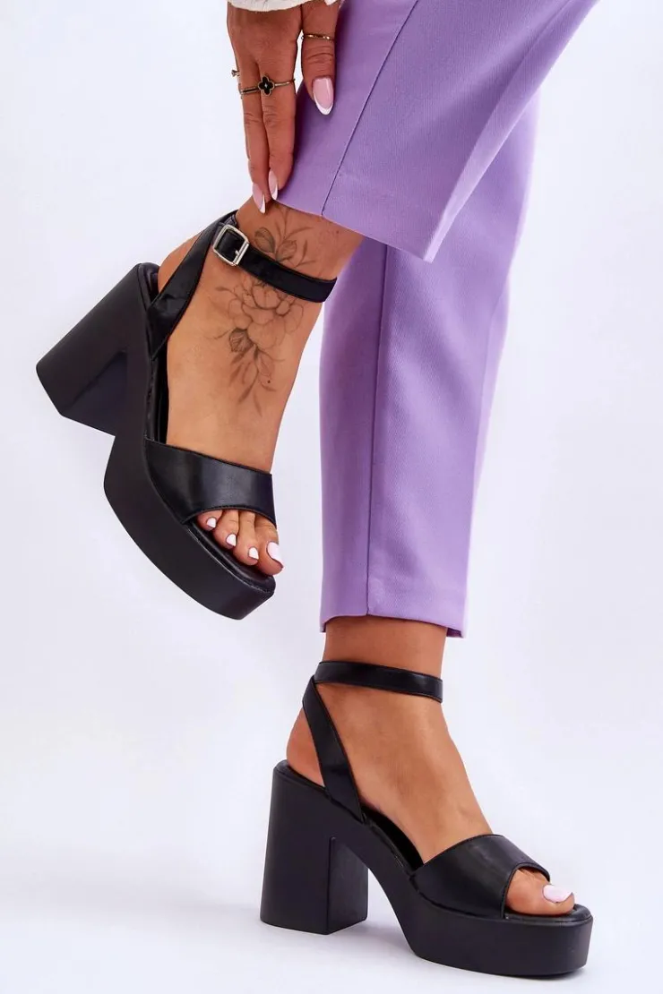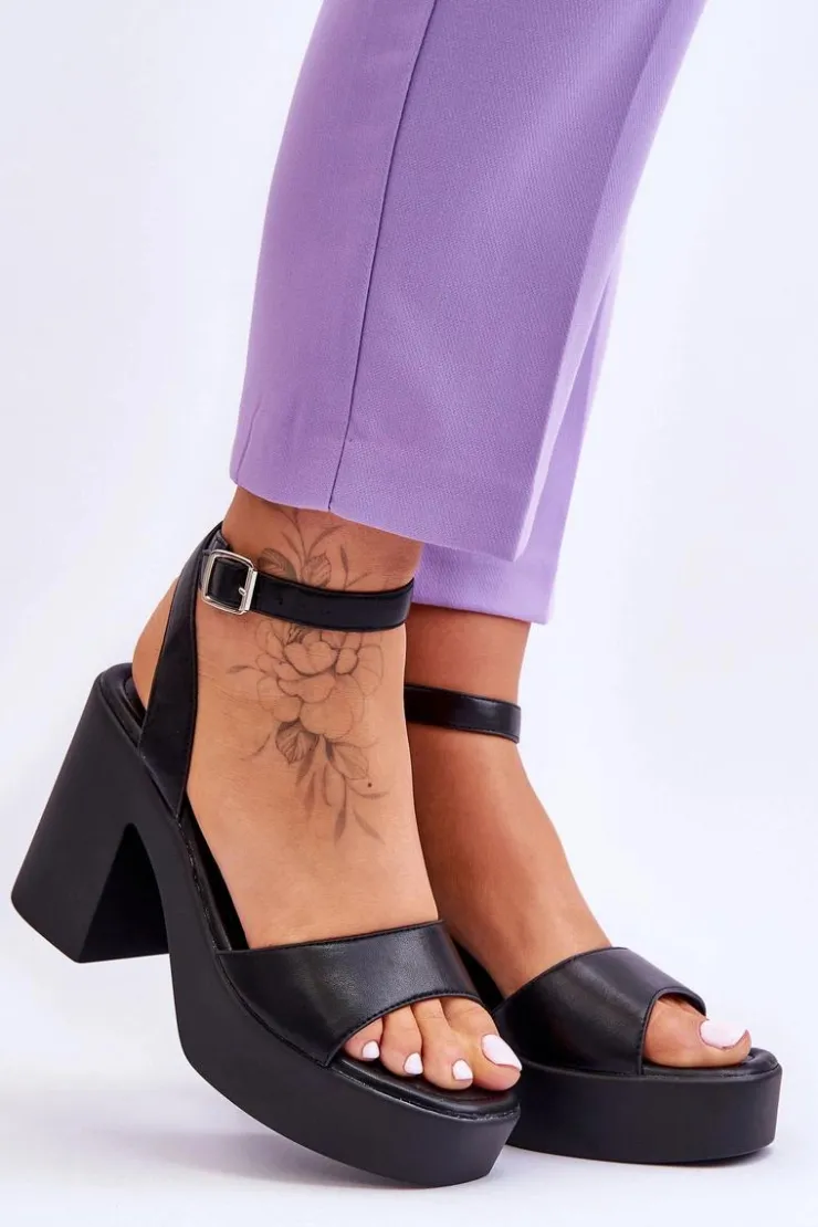 Damskie, modne sandałki zostały wykonane z eko skóry. Model ten posiada klasyczne zapinanie na regulowany pasek ze sprzączką. Sandałki osadzono na masywnej platformie oraz obcasie w postaci szerokiego słupka. Model ten posiada na przodzie szerszy paseczek. Miękka wkładka z eko skóry zapewni wygodne użytkowanie. Przy wyborze rozmiaru prosimy sugerować się tabelą rozmiarów.