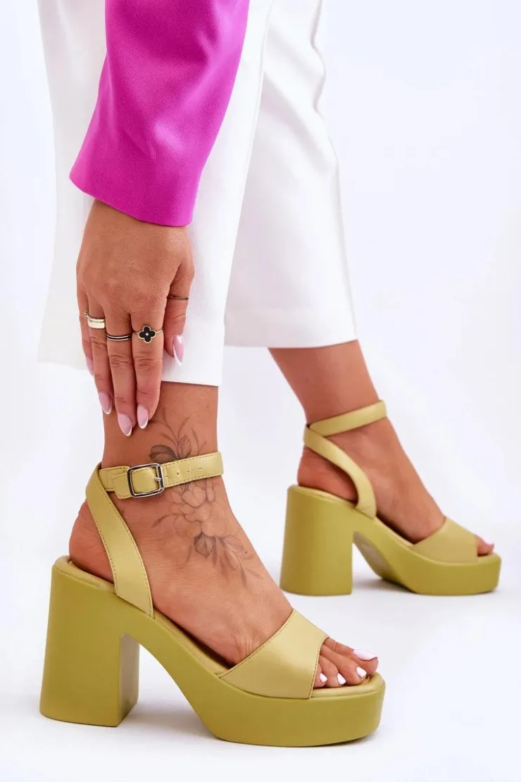 Damskie, modne sandałki zostały wykonane z eko skóry. Model ten posiada klasyczne zapinanie na regulowany pasek ze sprzączką. Sandałki osadzono na masywnej platformie oraz obcasie w postaci szerokiego słupka. Model ten posiada na przodzie szerszy paseczek. Miękka wkładka z eko skóry zapewni wygodne użytkowanie. Przy wyborze rozmiaru prosimy sugerować się tabelą rozmiarów.