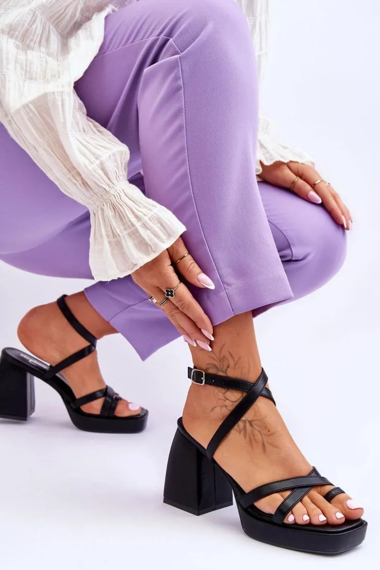 Wyjątkowe sandałki damskie wykonane z eko skóry świetnie sprawdzą się w wielu stylizacjach! Miękka wkładka zapewni wygodne użytkowanie. Sandałki posiadają z przodu paseczki. Zapinane wokół kostki na regulowany pasek ze sprzączką. Model ten został osadzony na masywnym, wyższym obcasie i platformie. Przy wyborze rozmiaru prosimy sugerować się tabelą rozmiarów.