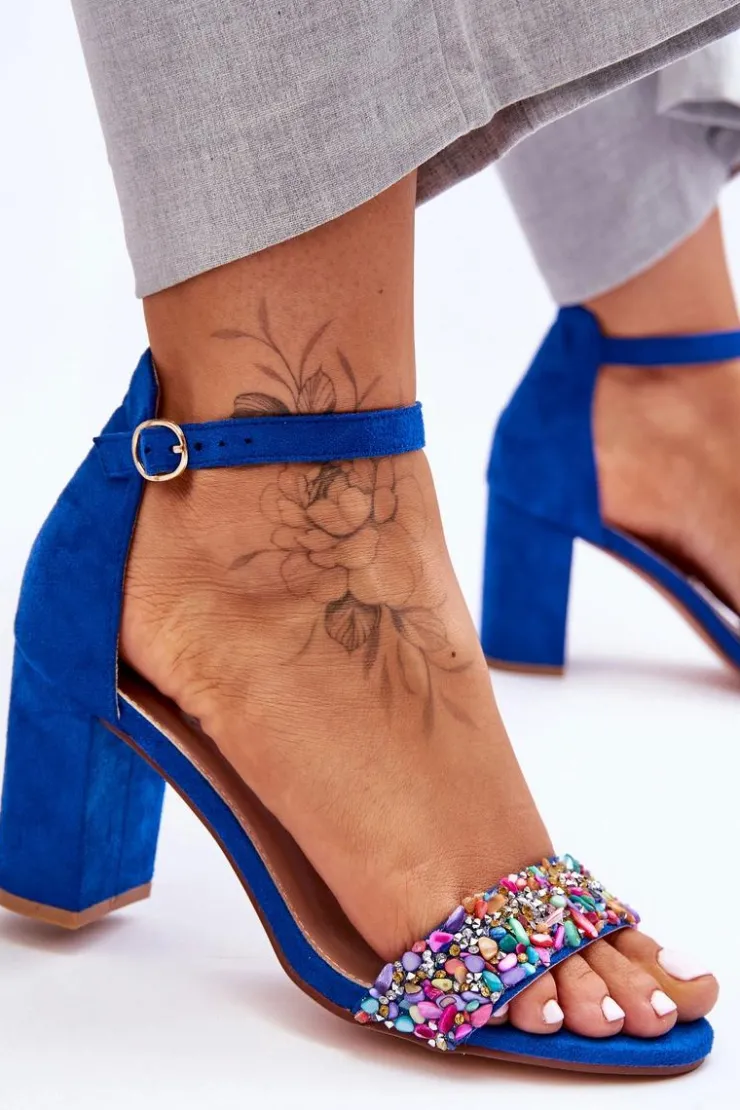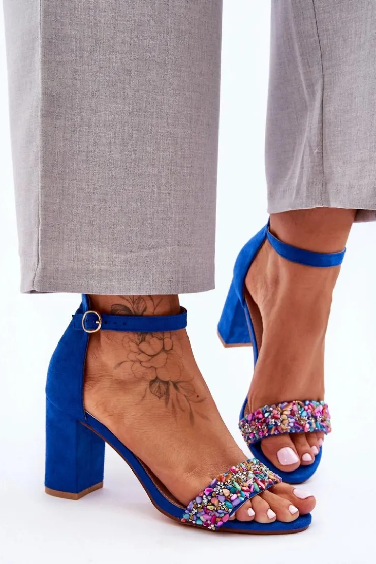 Modne sandały damskie zostały wykonane z miłego w dotyku eko zamszu. Osadzone na obcasie w postaci słupka. Paseczek na przodzie został ozdobiony modnymi kamieniami, co dodaje tym butom elegancji. Miękka wkładka z eko skóry zadba o Twój komfort podczas użytkowania. Model ten świetnie sprawdzi się na różnego rodzaju ważnych uroczystościach czy spotkaniach biznesowych. Przy wyborze rozmiaru prosimy sugerować się tabelą rozmiarów.