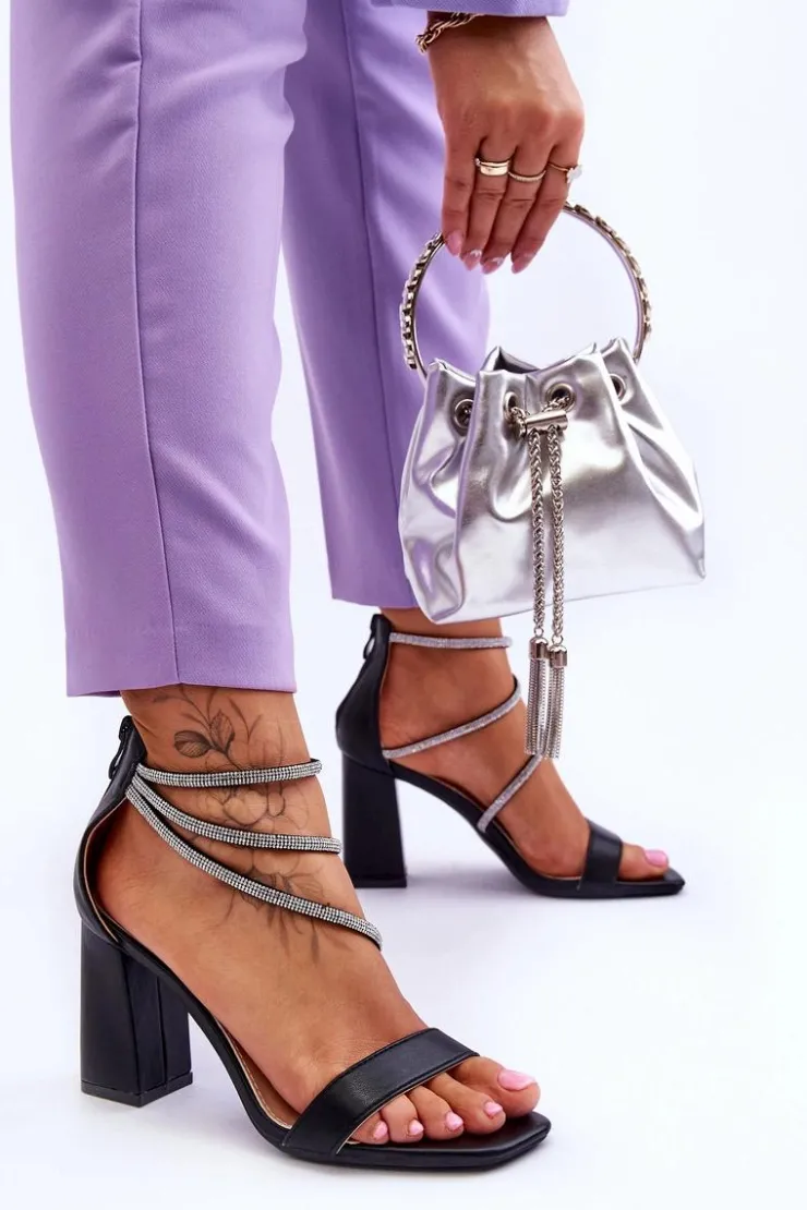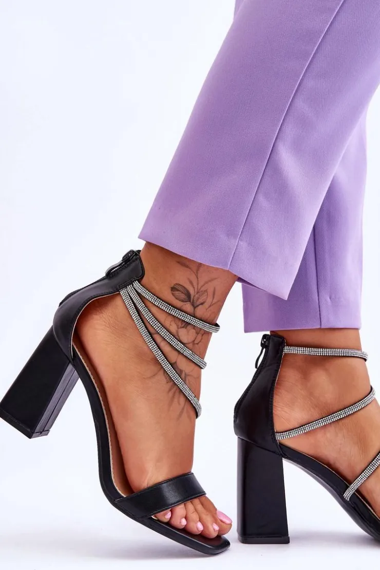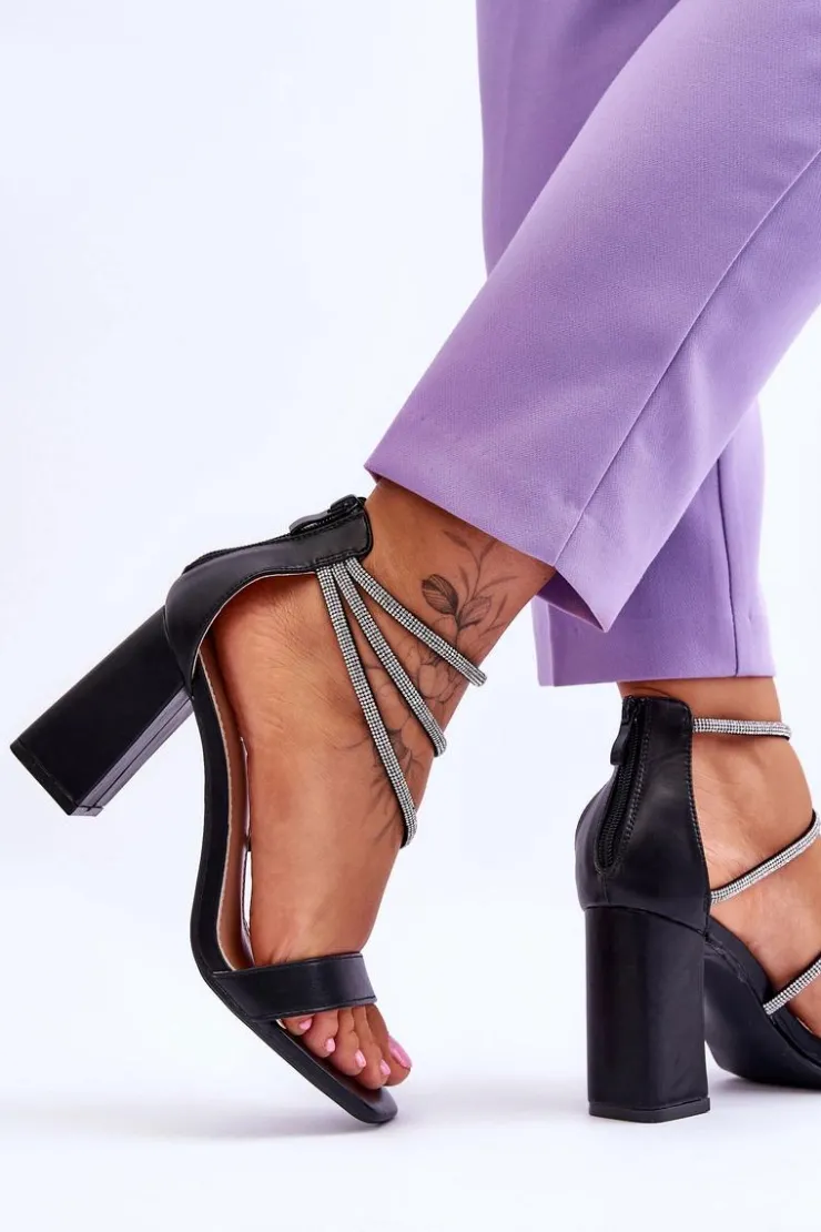 Cudne sandały na obcasie w postaci słupka zostały wykonane z eko skóry. Sandałki posiadają na wysokości kostki paseczki z dżetami imitującymi cyrkonie. Nosek odkryty, kwadratowy. Wkładka z eko skóry zapewni komfort podczas użytkowania. Model ten jest zapinany na suwak z tyłu cholewki. Sandałki z pewnością wykorzystasz do wielu stylizacji! Przy wyborze rozmiaru prosimy sugerować się tabelą rozmiarów.
