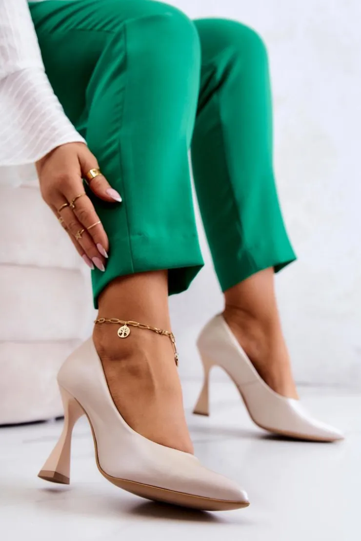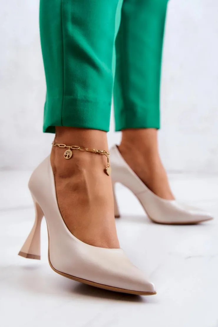 Te czółenka to HIT tego roku! Osadzone na modnym obcasie zwężanym ku górze i szerszym na dole. Buty zostały wykonane z wysokiej jakości naturalnej skóry. Nosek w szpic. Ten fason jest stabilniejszy od klasycznych szpilek, dzięki nowoczesnemu obcasowi. Wkładka wykonana z naturalnej skóry jest bardzo miękka i komfortowa w użytkowaniu. Czółenka te idealnie sprawdzą się na uroczystościach rodzinnych, spotkaniach biznesowych czy randce! Przy wyborze rozmiaru prosimy kierować się tabelą rozmiarów