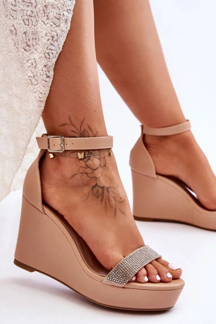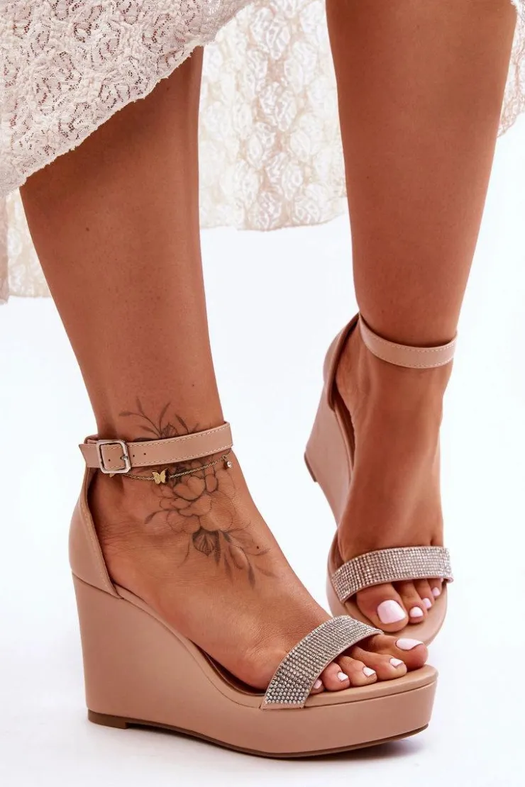 Cudowne, damskie sandały zostały wykonane z eko skóry. Posiadają zdobienia w postaci dżetów imitujących cyrkonie. Miękka wkładka z perforacją zapewni komfortowe użytkowanie obuwia. Dodatkowo zapiętek w tych butach jest usztywniany. Sandałki osadzono na platformie i koturnie. Model ten jest zapinany na regulowany pasek ze sprzączką. Przy wyborze rozmiaru prosimy sugerować się tabelą rozmiarów.