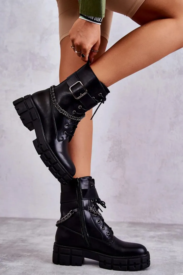 Niezwykłe i stylowe botki wykonane z eko skóry. Zapinane z boku cholewki na zamek oraz sznurowane. Dodatkowo botki posiadają regulowany pasek z klamrą. Ozdobny łańcuch jest przymocowany do cholewki i nie jest ściągany. Botki są wykonane z eko skóry. Posiadają ocieplenie w postaci koca obuwniczego. Osadzone na masywnym, płaskim obcasie i platformie. Przy wyborze rozmiaru prosimy sugerować się tabelą rozmiarów.