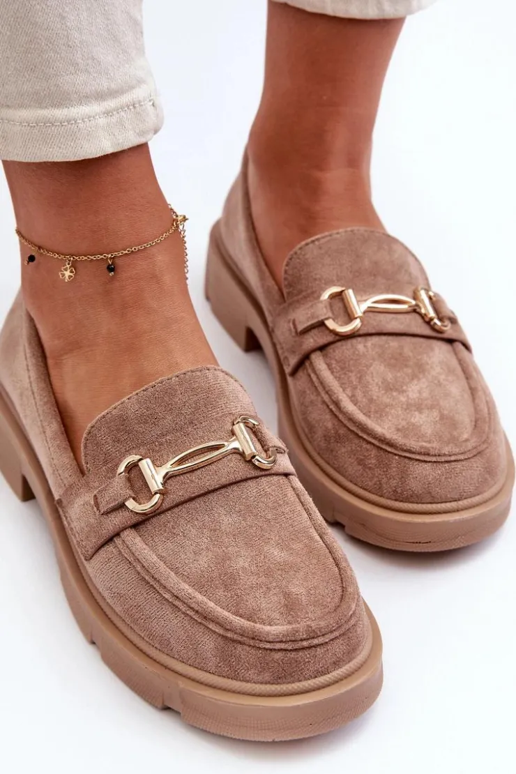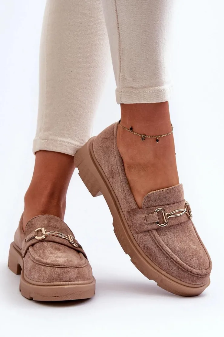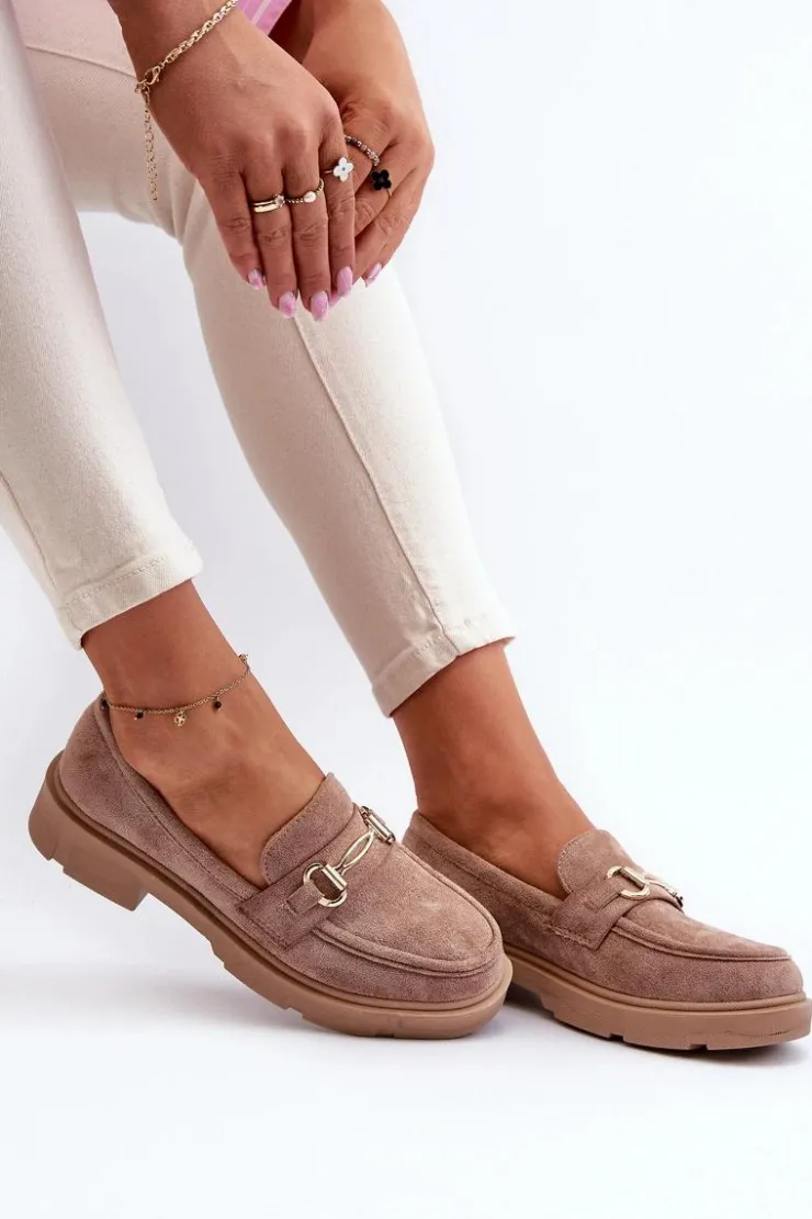 Modne damskie mokasyny wykonane z eko zamszu to absolutny must-have w Twojej garderobie! Przód ozdobiony paseczkiem ze złotą ozdobą, która dodaje im wyjątkowego uroku. Płaski obcas zapewnia wygodę noszenia przez cały dzień. Model ten będzie pasować do różnych stylizacji, dodając im elegancji! Przy wyborze rozmiaru prosimy sugerować się tabelą rozmiarów.