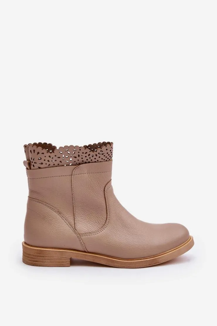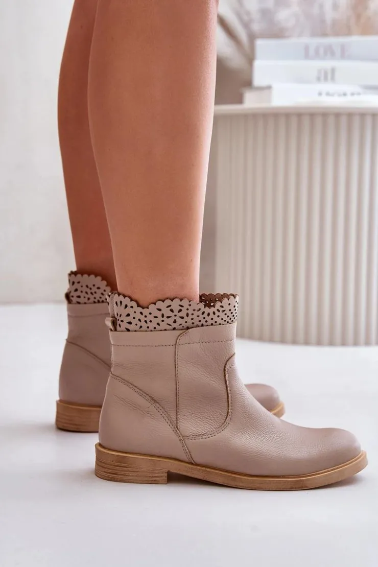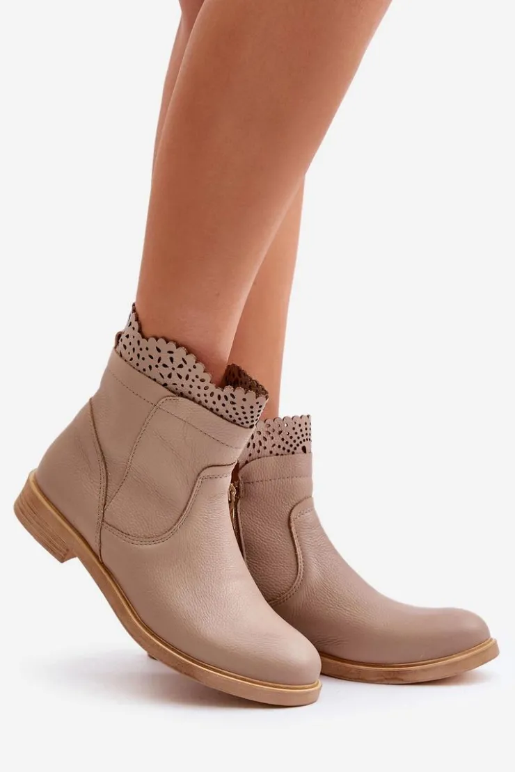 Te śliczne botki damskie zostały wykonane z wysokiej jakości naturalnej skóry. Osadzone na płaskim obcasie, co sprawia, że są niezwykle wygodne i stabilne. Zapinane na suwak z boku cholewki. Model ten posiada ażurowy element na górze cholewki. Noski zaokrąglone. Koniecznie powinnaś je mieć! Przy wyborze rozmiaru prosimy sugerować się tabelą rozmiarów.