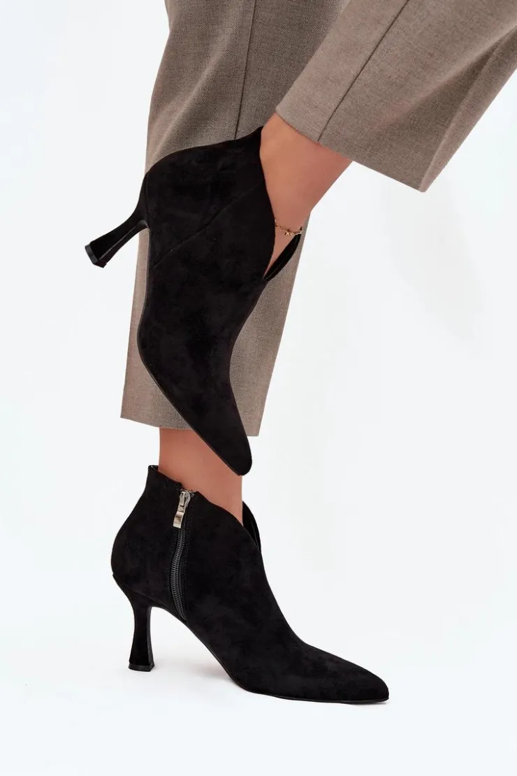 Niskie botki damskie wykonane z eko zamszu to elegancka propozycja dla kobiet, które cenią klasykę w nowoczesnym wydaniu. Osadzone na smukłej szpilce pięknie wysmuklają sylwetkę, a szpiczaste noski dodają całości szyku i podkreślają kobiecy charakter obuwia. Model zapinany jest na praktyczny zamek, co ułatwia zakładanie i zdejmowanie butów. Ciekawym elementem wyróżniającym ten fason jest asymetryczna cholewka, która nadaje oryginalnego wyglądu i sprawia, że prezentują się wyjątkowo stylowo. To doskonały wybór do eleganckich stylizacji – zarówno na co dzień, jak i na specjalne okazje. Przy wyborze rozmiaru prosimy sugerować się tabelą rozmiarów.