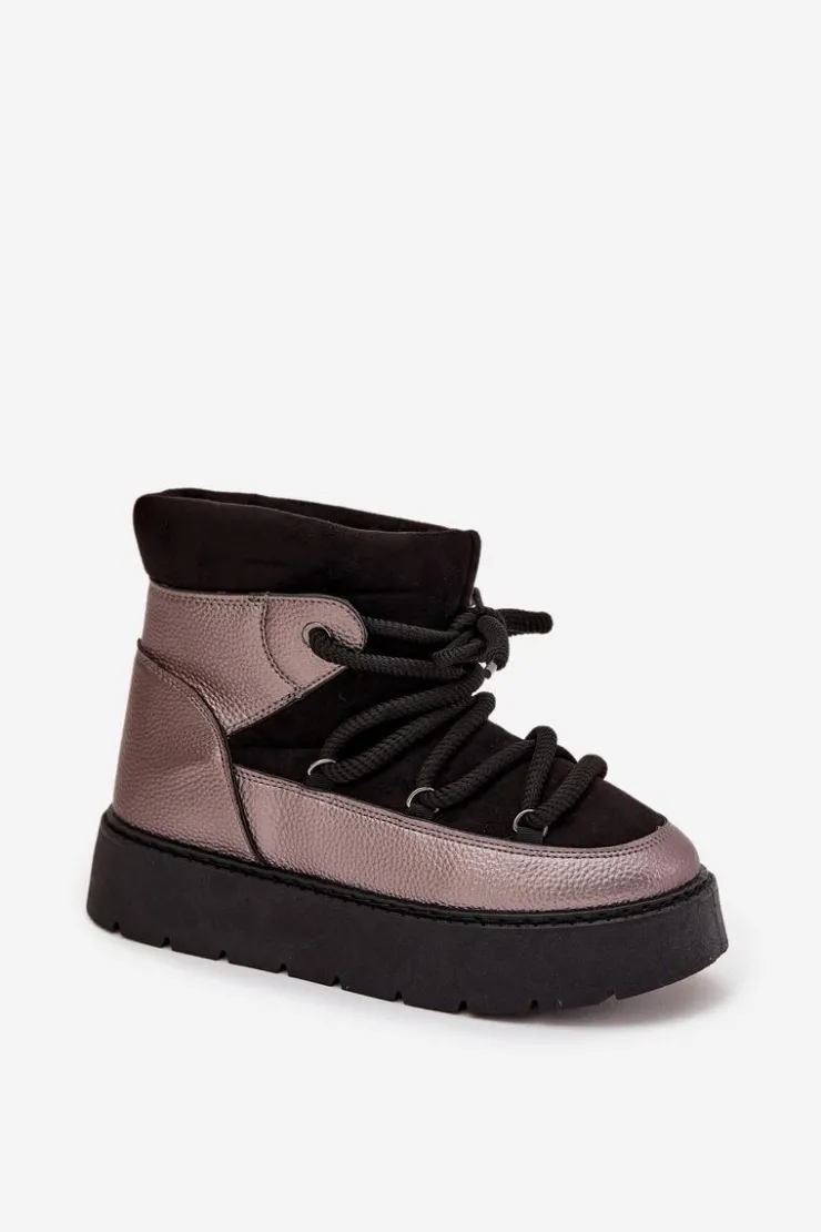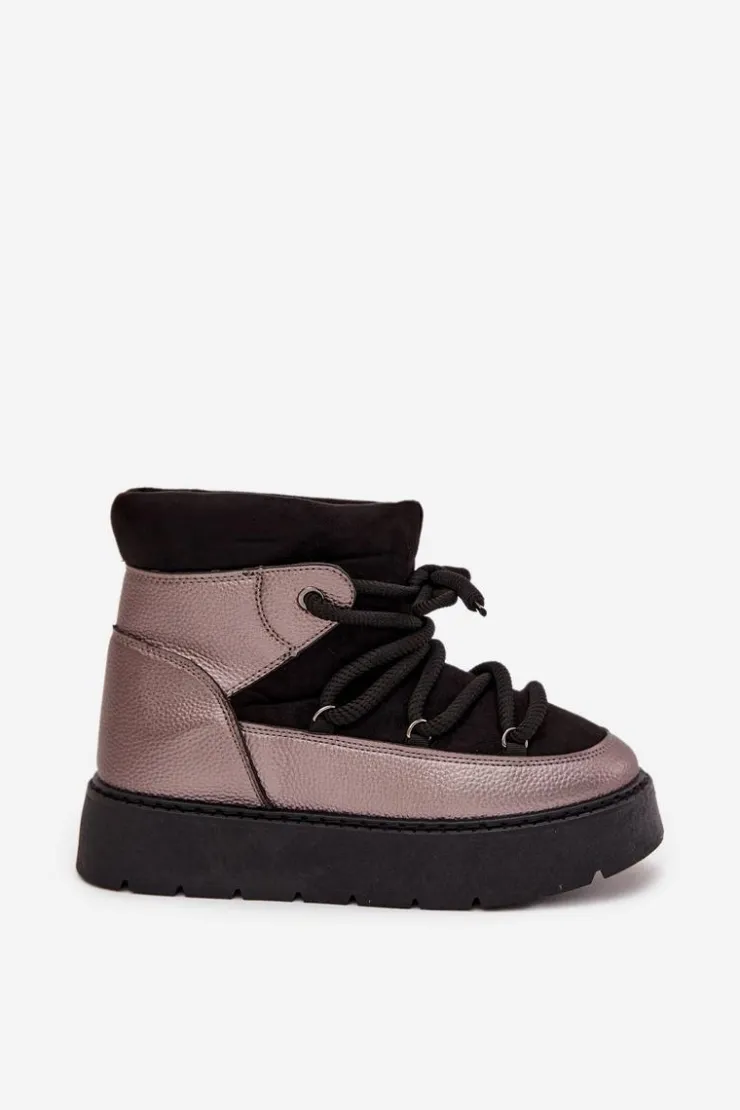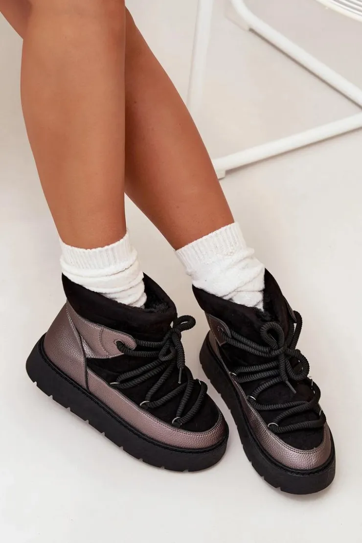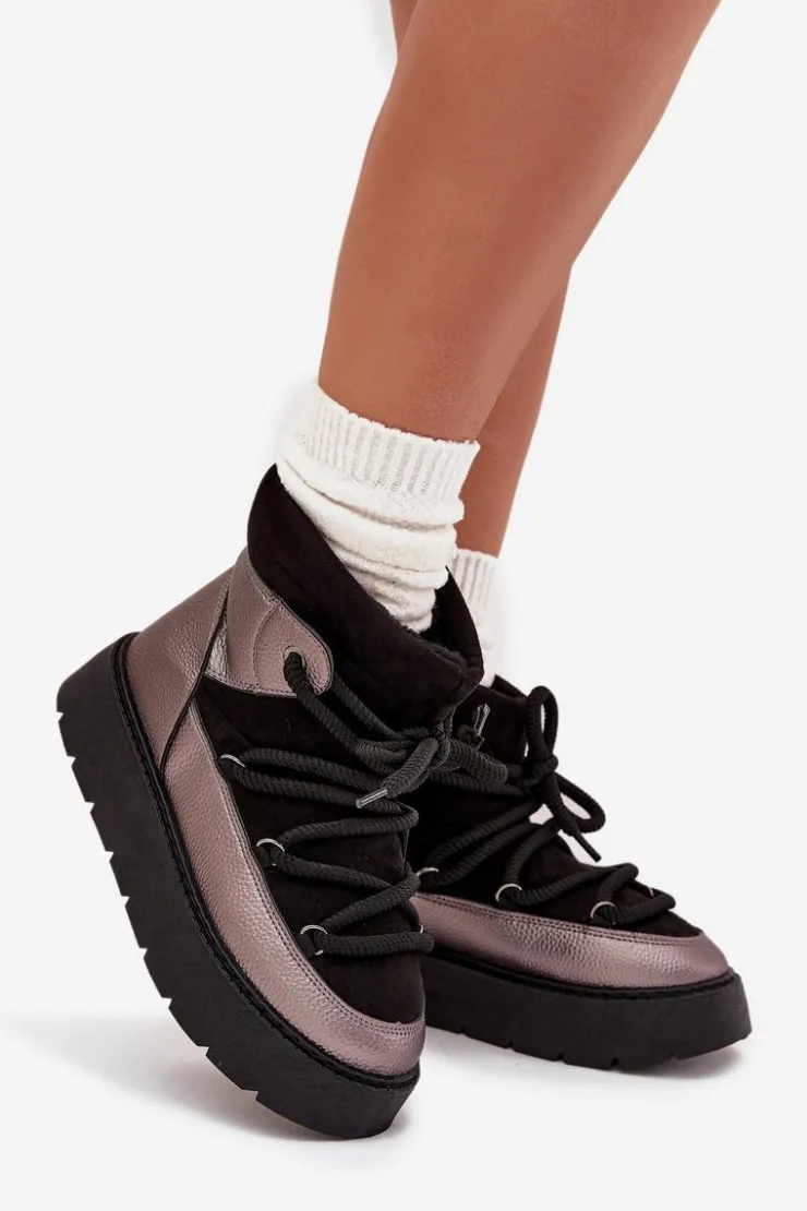 Damskie niskie śniegowce wykonane z połączenia eko zamszu i eko skóry to świetny wybór na zimowe dni. Osadzone na platformie, zapewniają komfort i stabilność, a grube wiązanie z przodu dodaje im charakteru. Środek ocieplony grubym futerkiem gwarantuje ciepło nawet w najbardziej mroźne dni. Idealne na zimowe wyjazdy, spacery czy codzienne stylizacje, te śniegowce łączą funkcjonalność z modnym wyglądem. Przy wyborze rozmiaru prosimy sugerować się tabelą rozmiarów.