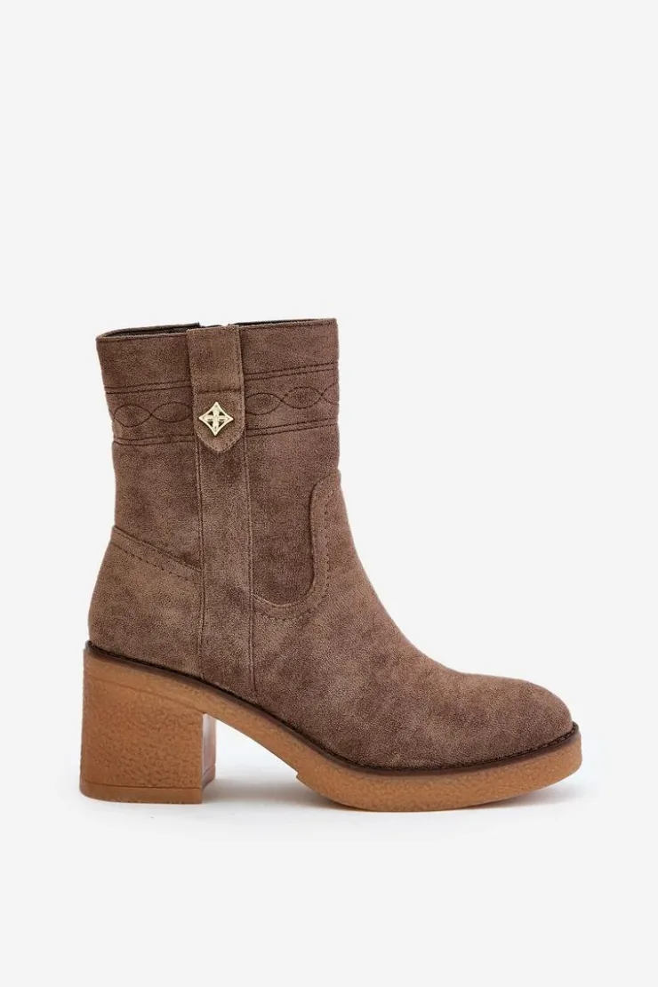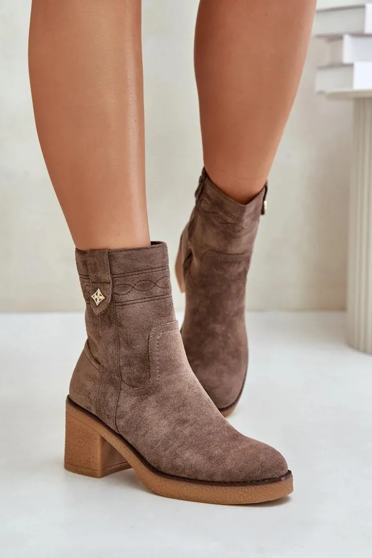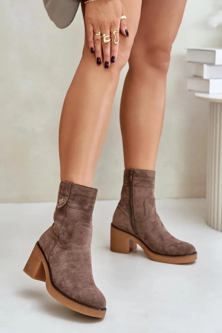 Klasyczne botki damskie wykonane z eko zamszu. Osadzone na obcasie w formie słupka. Noski zaokrąglone. Model ten wyróżnia się przeszyciami na cholewce oraz małym detalem. Wnętrze ocieplane miękkim kocem obuwniczym, idealne na chłodniejsze dni. Przy wyborze rozmiaru prosimy sugerować się tabelą rozmiarów.