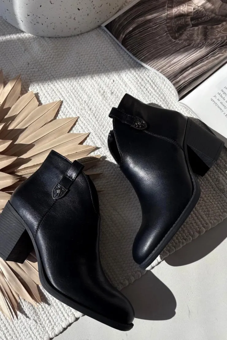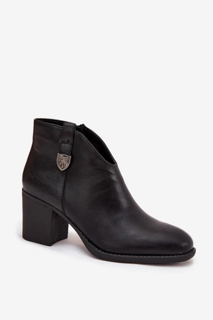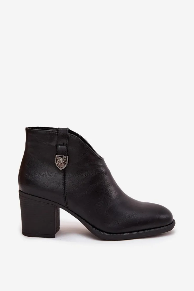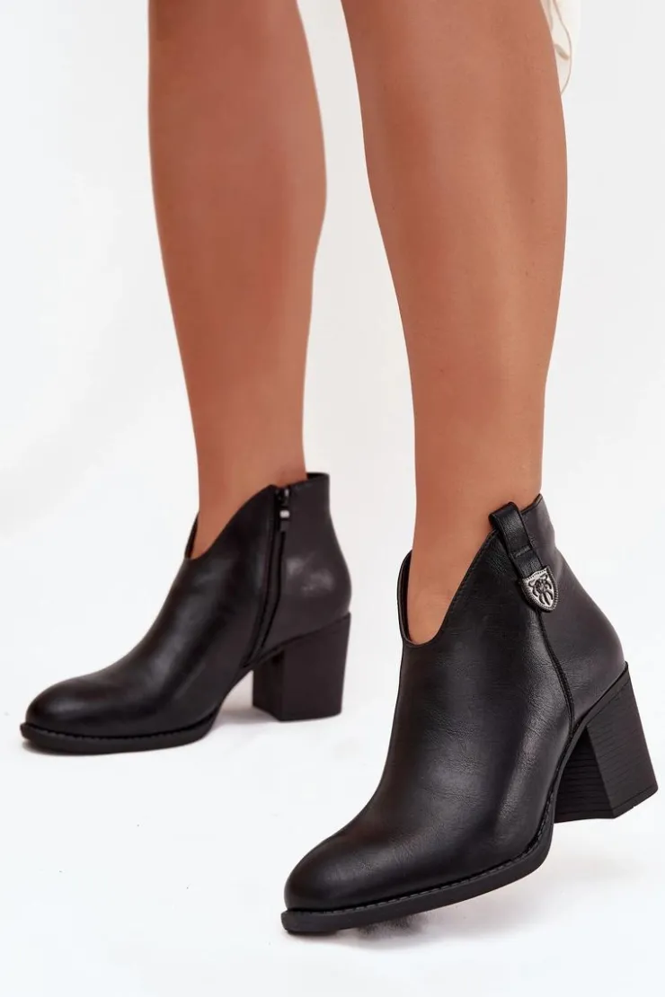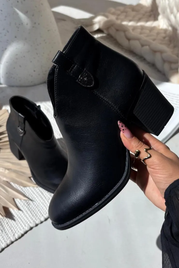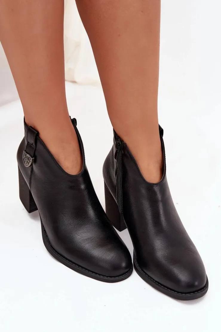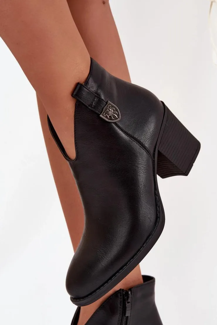 Damskie botki od marki Jezzi. Wykonane z eko skóry. Wnętrze ocieplone kocem obuwniczym zapewnia komfort i ciepło, a niski fason z zamkiem gwarantuje wygodę zakładania i codziennego noszenia. Subtelnym akcentem jest krótki pasek z ozdobnym detalem umieszczony na górze cholewki, który dodaje całości elegancji i nowoczesnego charakteru. Doskonałe zarówno do spodni, jak i sukienek. Przy wyborze rozmiaru prosimy sugerować się tabelą rozmiarów.