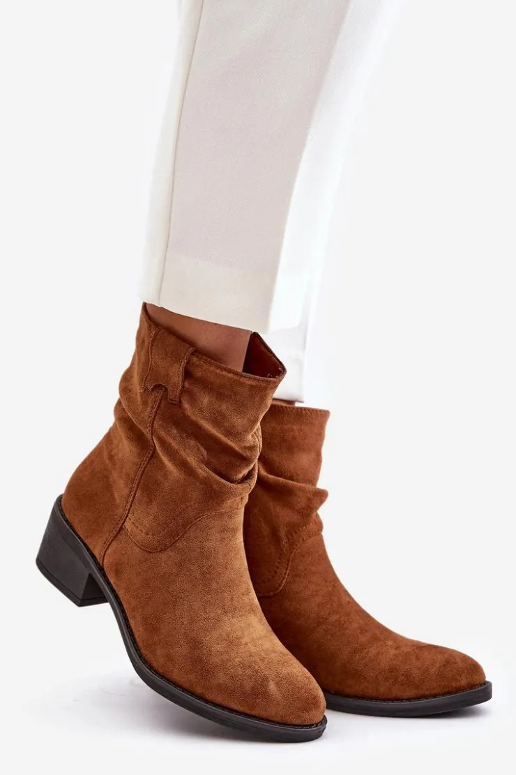 Klasyczne damskie botki wykonane z eko zamszu. Osadzone na niskim, stabilnym obcasie. Noski zaokrąglone. Zapinane na zamek. Model ten wyróżnia się marszczeniami na cholewce. Środek ocieplany kocem obuwniczym, co zapewni ciepło w chłodniejsze dni. Przy wyborze rozmiaru prosimy sugerować się tabelą rozmiarów.
