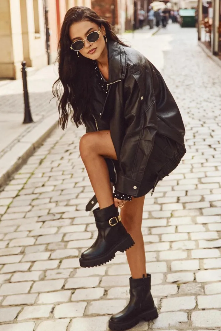 Damskie botki wykonane z eko skóry. Osadzone na platformie z płaskim obcasem zapewniają wygodę i stabilność podczas chodzenia. Wnętrze ocieplane miękkim kocem obuwniczym gwarantuje komfort oraz ciepło, nawet w zimniejsze dni. Botki zapinane są na praktyczny zamek, dzięki czemu łatwo się je zakłada i zdejmuje. Dodatkowym akcentem jest stylowy pasek z klamrą na cholewce, który nadaje całości modnego, nieco rockowego charakteru. Świetnie sprawdzą się w casualowych stylizacjach z jeansami, jak i w zestawieniach z sukienką czy spódnicą. Przy wyborze rozmiaru prosimy sugerować się tabelą rozmiarów.