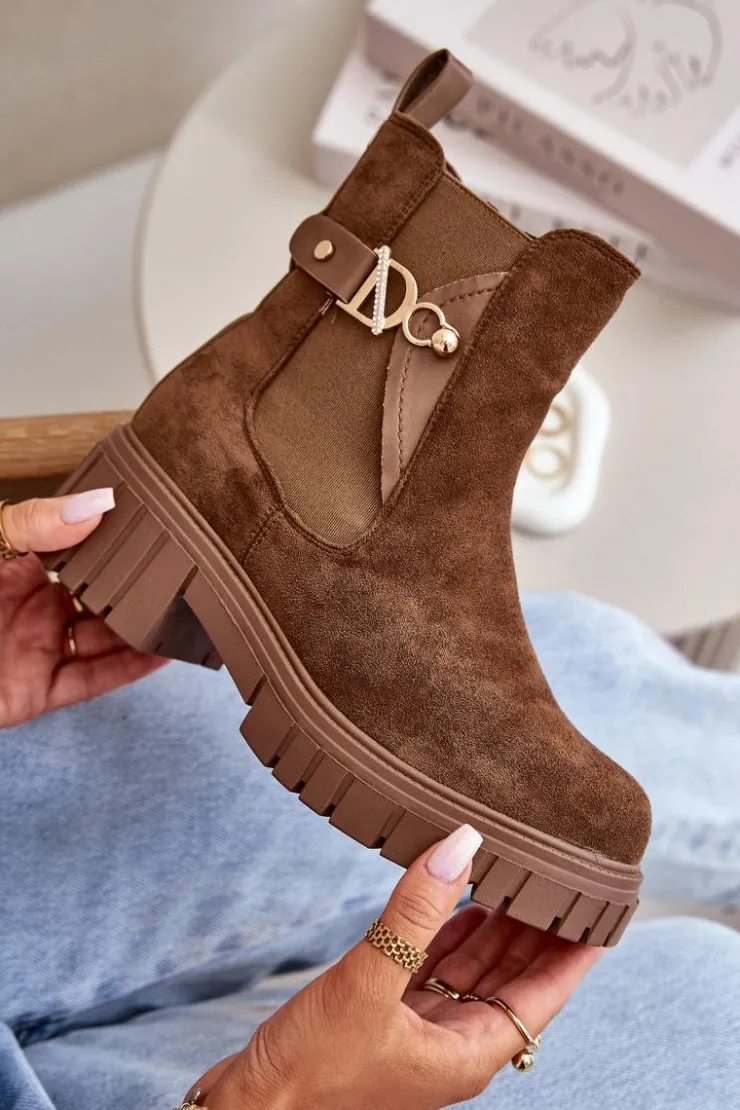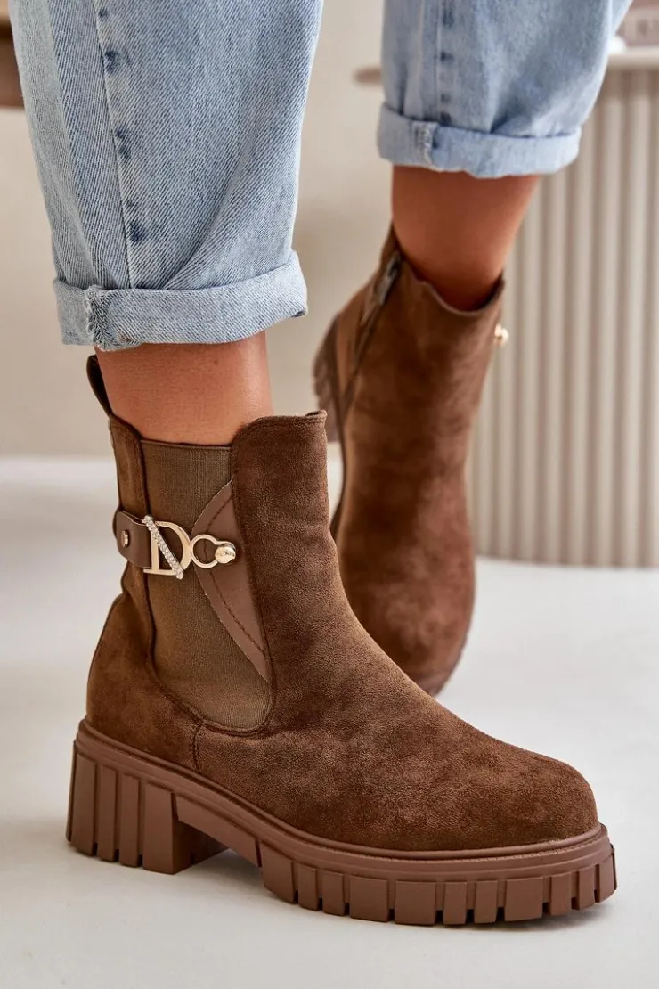 Botki damskie wykonane z miękkiego eko zamszu. Wnętrze ocieplone kocem obuwniczym sprawia, że są one doskonałym rozwiązaniem na chłodne dni. Wyróżniającym się elementem tego modelu jest złoty detal, który dodaje im wyjątkowego uroku i elegancji. Zapinanie na zamek ułatwia zakładanie i zdejmowanie obuwia. Doskonale sprawdzą się w połączeniu z różnymi elementami garderoby, od jeansów po eleganckie sukienki, podkreślając unikalny styl każdej kobiety. Przy wyborze rozmiaru prosimy sugerować się tabelą rozmiarów.