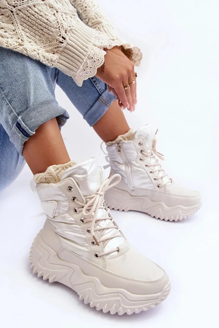 Botki damskie w sportowym stylu. Osadzone na masywnej platformie. Wewnątrz znajduje się ciepłe i miłe w dotyku futerko. Zapinane na suwak po wewnętrznej stronie cholewki oraz dodatkowo sznurowane. Buty idealnie sprawdzą się w zimowe dni! Przy wyborze rozmiaru prosimy sugerować się tabelą rozmiarów.