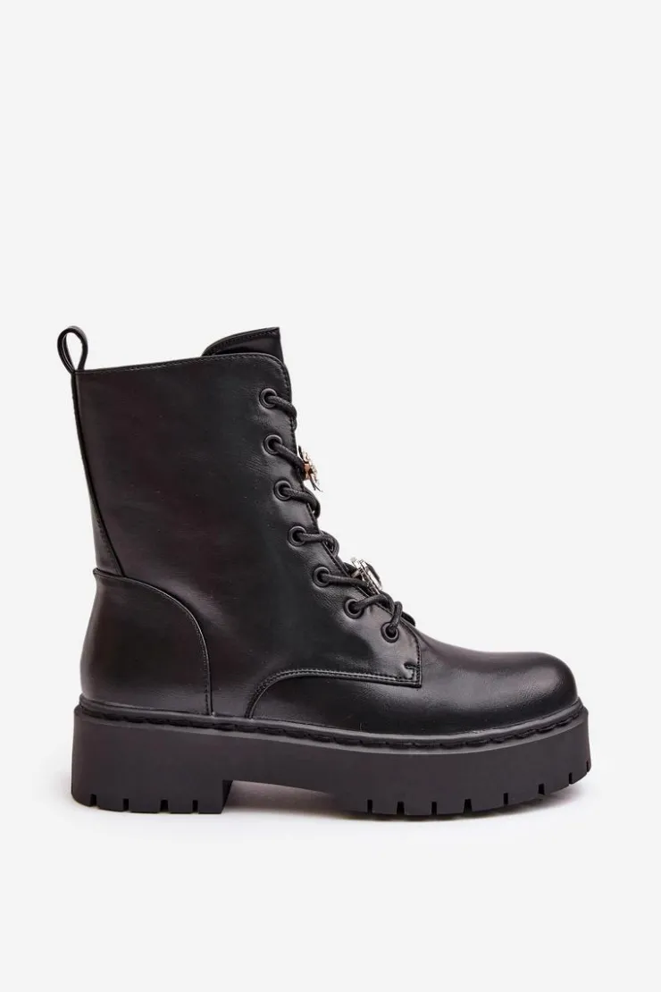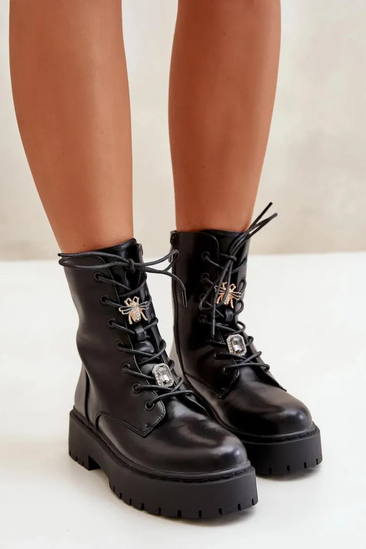Damskie botki wykonane z ekologicznej skóry. Posiadają płaski obcas i zaokrąglone noski, co zapewnia komfort noszenia. Dzięki bocznemu suwakowi zakładanie jest szybkie i proste, a dodatkowe sznurowanie z ozdobnymi przypinkami dodaje unikalnego charakteru. Środek ocieplony kocem obuwniczym. Doskonale uzupełnią Twoje outfity w chłodniejsze dni.Przy wyborze rozmiaru prosimy sugerować się tabelą rozmiarów.