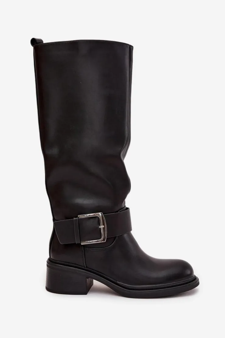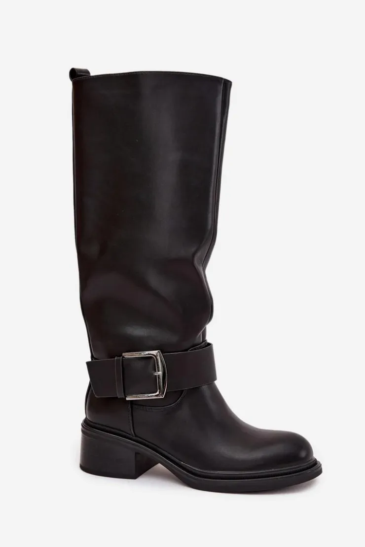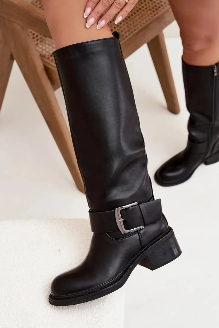 Kozaki damskie wykonane z eko skóry. Osadzone na stabilnym obcasie typu klocek zapewniają komfort noszenia i świetną stabilność, dzięki czemu sprawdzą się zarówno na co dzień, jak i podczas dłuższych wyjść. Wnętrze wykończone miękkim kocem obuwniczym gwarantuje ciepło i wygodę w chłodniejsze dni. Charakterystycznym elementem tego modelu jest dekoracyjny pasek z dużą klamrą umieszczony w dolnej części cholewki, który nadaje wyrazistego, modnego akcentu. Dzięki temu kozaki zyskują nowoczesny charakter i przyciągają uwagę, doskonale komponując się zarówno z jeansami, jak i z sukienkami czy spódnicami. To idealne obuwie dla kobiet, które chcą połączyć klasykę z nutą oryginalności. Przy wyborze rozmiaru prosimy sugerować się tabelą rozmiarów.