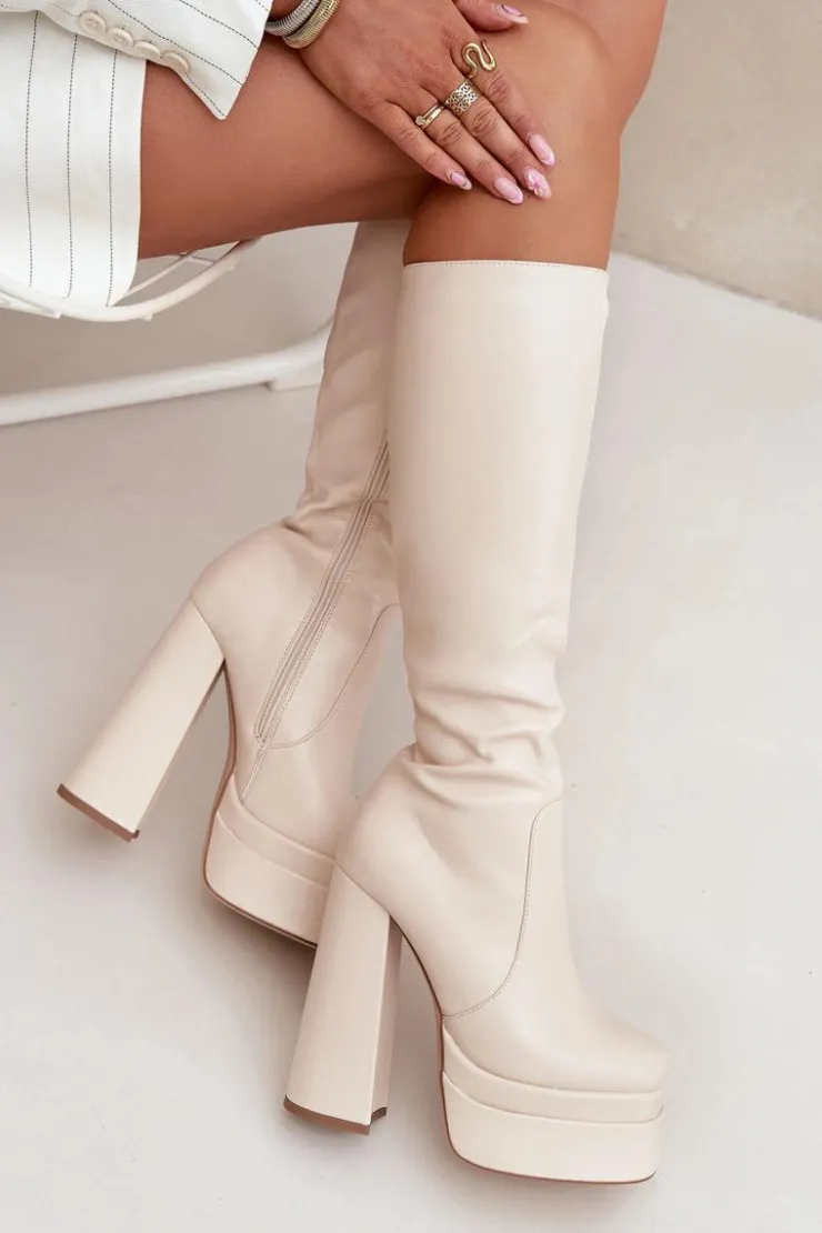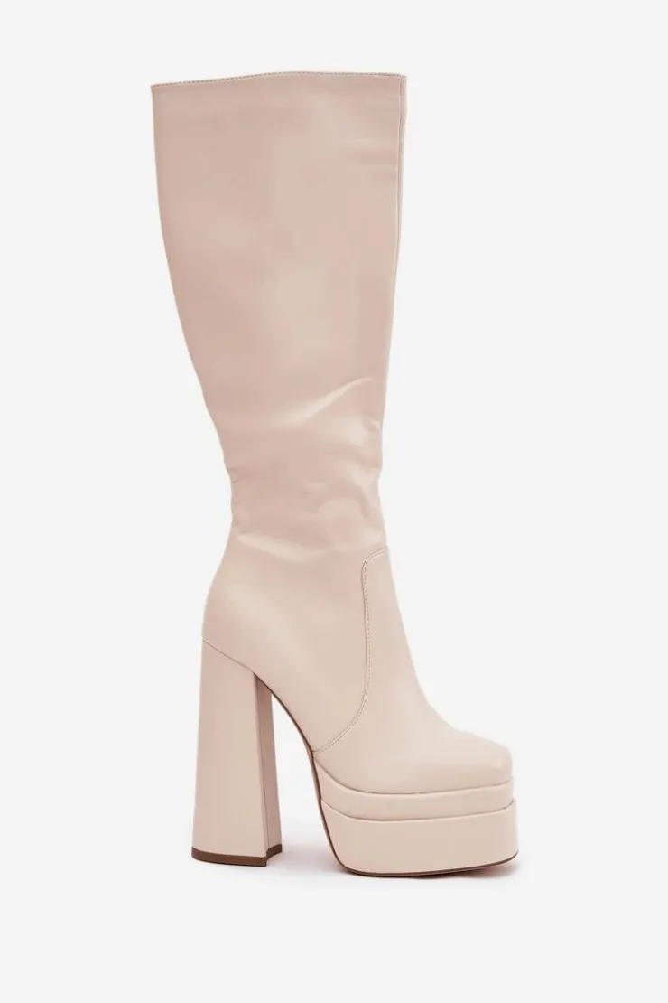 Kozaki damskie z eko skóry, osadzone na obcasie w formie słupka i platformie. Zapinane na zamek, zapewniają łatwość zakładania, a zaokrąglone noski dodają komfortu. Cholewka sięgająca do kolana, wraz z ociepleniem kocem obuwniczym, zapewnia ciepło i komfort nawet w chłodniejsze dni. Te kozaki doskonale komponują się z zimowymi stylizacjami. Przy wyborze rozmiaru prosimy sugerować się tabelą rozmiarów.