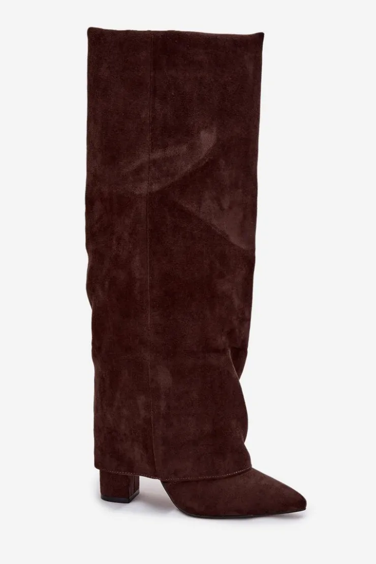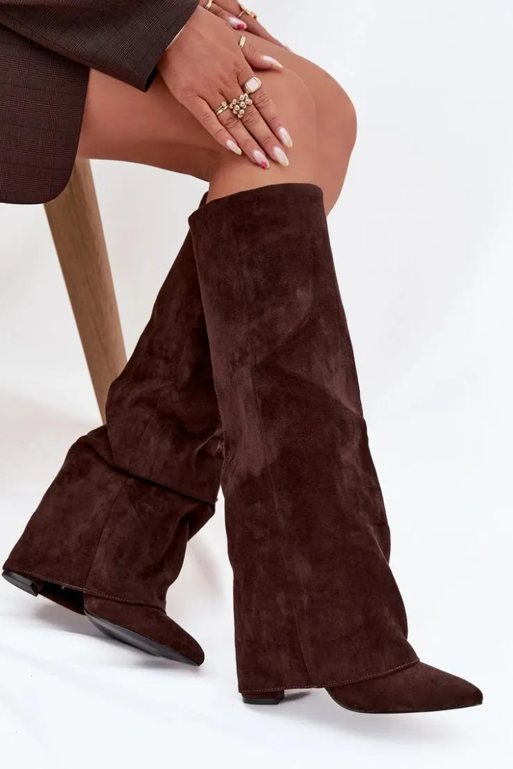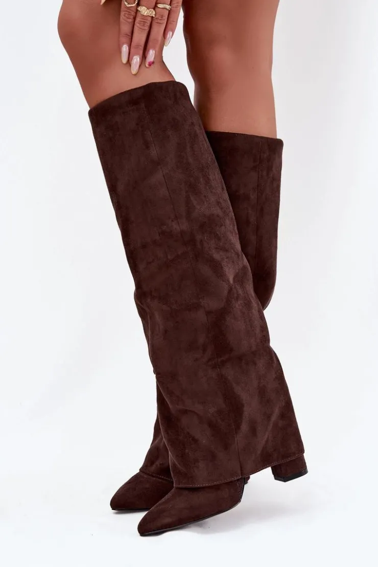 Kozaki damskie z wywiniętą cholewką to prawdziwy must-have na nadchodzący sezon jesienno-zimowy! Wsuwane i osadzone na stabilnym obcasie typu słupek, gwarantują wygodę i pewny krok. Ocieplenie zapewnia komfort w chłodniejsze dni, a wywinięta cholewka, nachodząca na obcas, dodaje im oryginalnego charakteru. Szpiczaste noski podkreślają kobiecy styl, dzięki czemu kozaki świetnie sprawdzą się w efektownych, zimowych stylizacjach. Przy wyborze rozmiaru prosimy sugerować się tabelą rozmiarów.