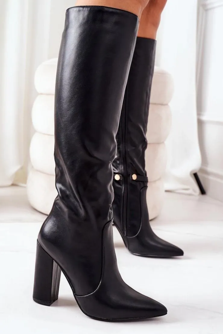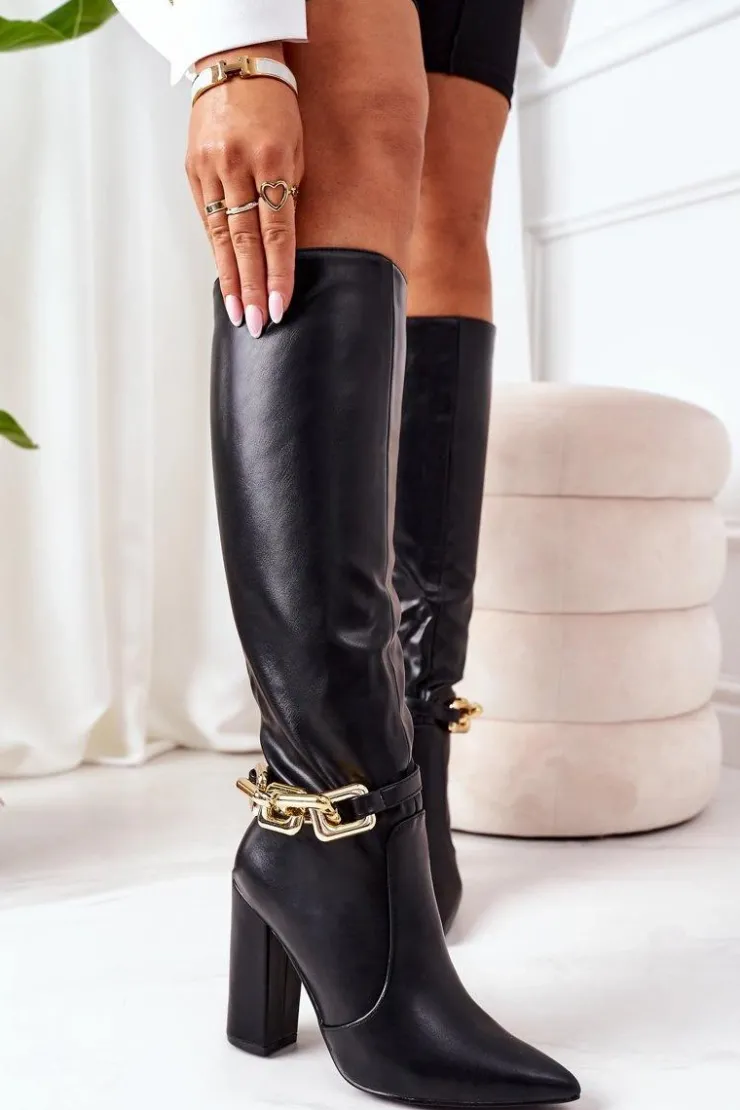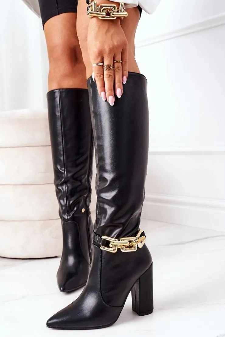 Piękne kozaki na słupku z noskiem w szpic. Cholewka wykonana jest ze skóry ekologicznej. Złoty łańcuch jest odpinany. Przy wyborze rozmiaru prosimy sugerować się tabelą rozmiarów.