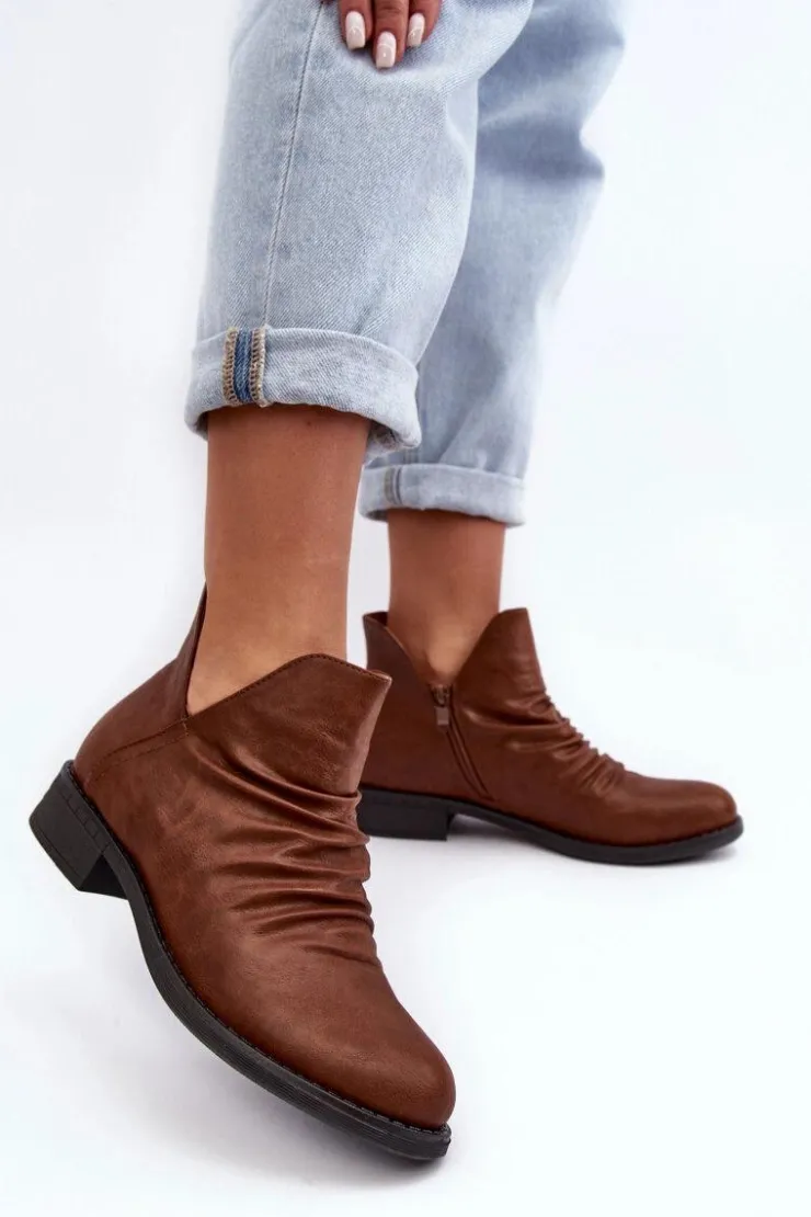 Niskie botki damskie wykonane z eko skóry. Osadzone na płaskim, stabilnym obcasie. Cholewka z wycięciami na bokach. Z przodu marszczenie. Środek ocieplony kocem obuwniczym. Noski zaokrąglone. Model ten zapinany jest na suwak z boku. Przy wyborze rozmiaru prosimy sugerować się tabelą rozmiarów.
