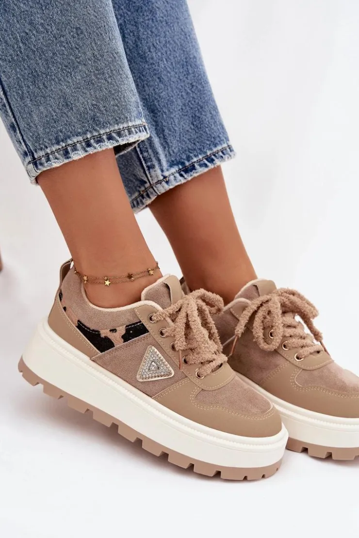 Sneakersy damskie na platformie to stylowy i wygodny model idealny na chłodniejsze dni. Wykonane z dbałością o detale, posiadają ocieplenie z miękkiego polaru, które zapewnia komfort i ciepło. Zaokrąglone noski oraz klasyczne sznurowanie gwarantują wygodne dopasowanie do stopy. Z boku cholewki znajduje się ozdobny element, który nadaje modnego charakteru i wyróżnia je na tle klasycznych modeli. Te sneakersy doskonale sprawdzą się w casualowych stylizacjach.