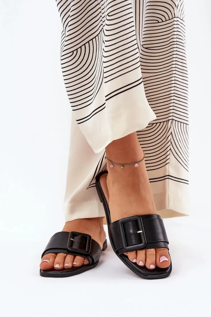 Klasyczne klapki damskie z eko skóry, osadzone na płaskim obcasie, które łączą wygodę z eleganckim wyglądem. Duża klamra na pasku dodaje im subtelnego charakteru. Idealne na co dzień, te klapki doskonale komponują się z letnimi stylizacjami, zapewniając komfort i prostą elegancję przez cały dzień. Przy wyborze rozmiaru prosimy sugerować się tabelą rozmiarów.
