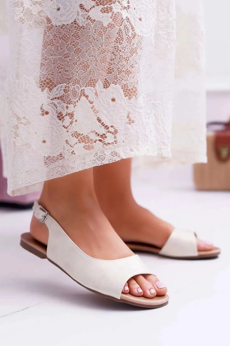 Złote płaskie sandały. Wykonane ze skóry ekologicznej. Zapinane na pasek. Przy wyborze rozmiaru prosimy kierować się tabelą rozmiarów.