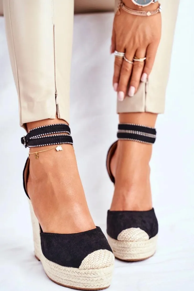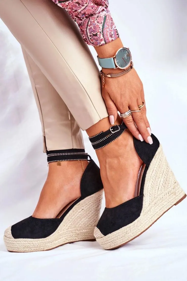Damskie Boto Sandały Damskie Na Koturnie Lniane Czarne Canterola