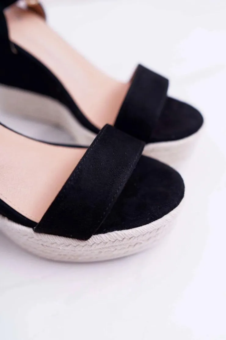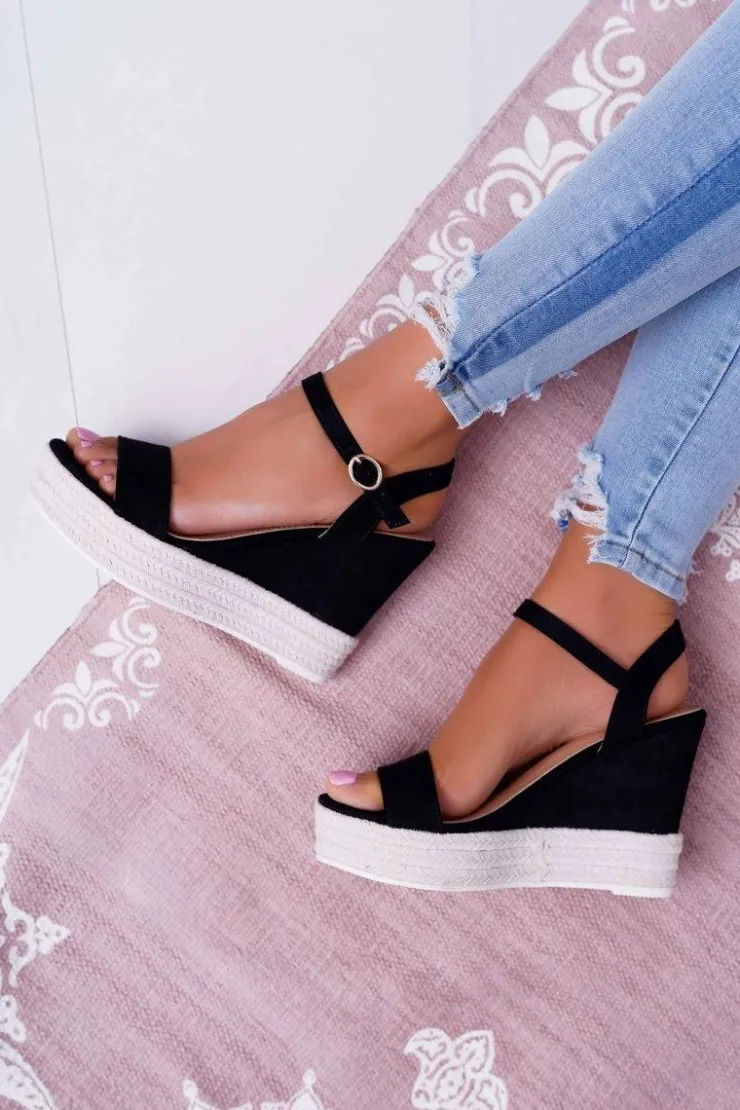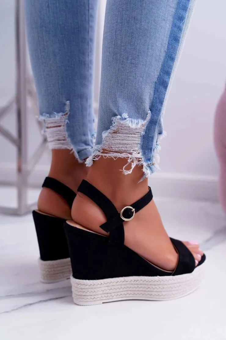 Damskie Boto Sandały Damskie Na Koturnie Lniane Czarne Liviana