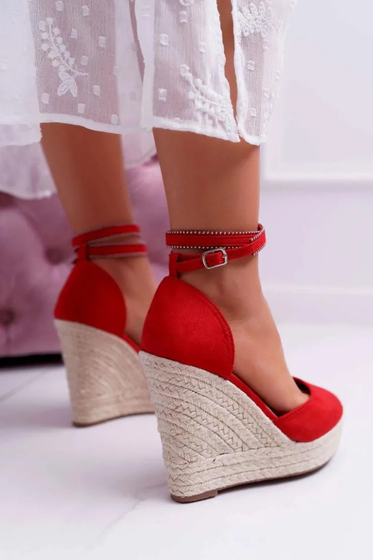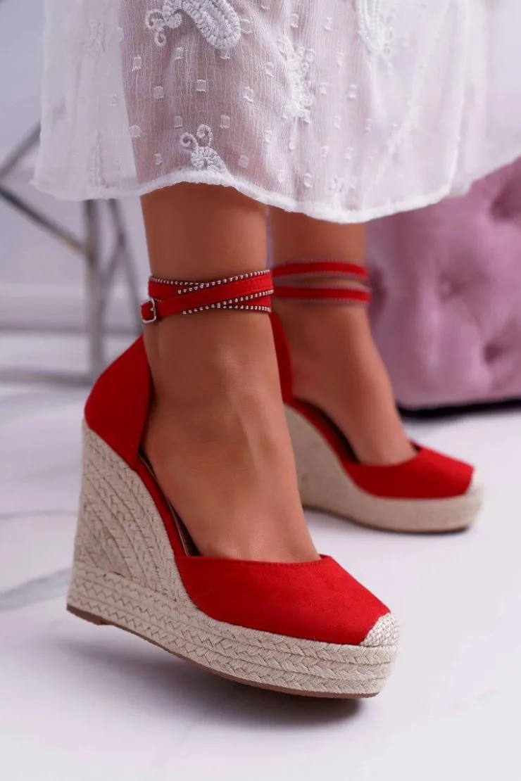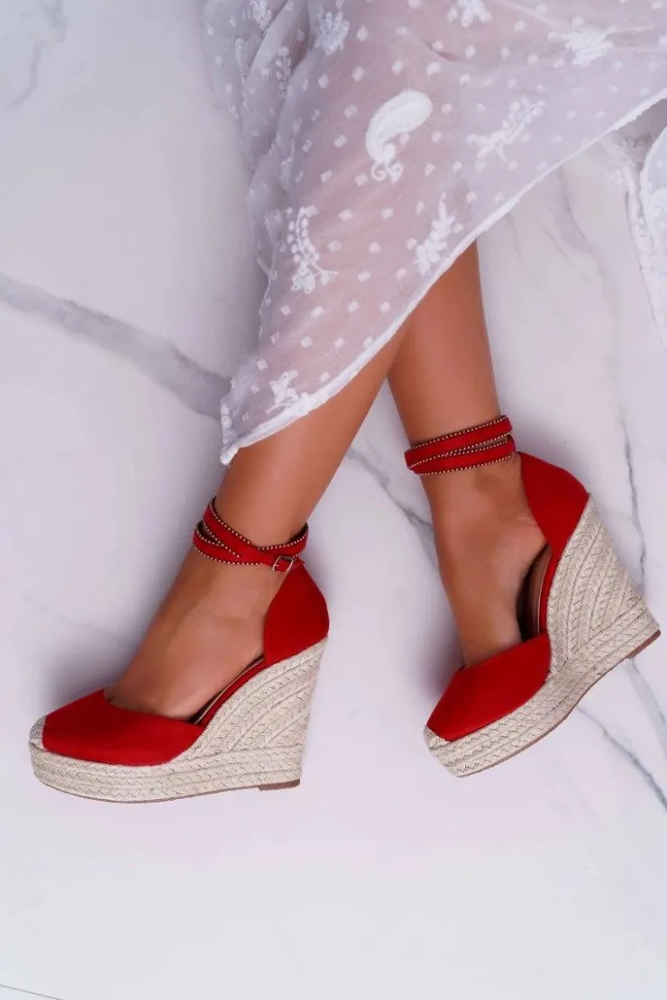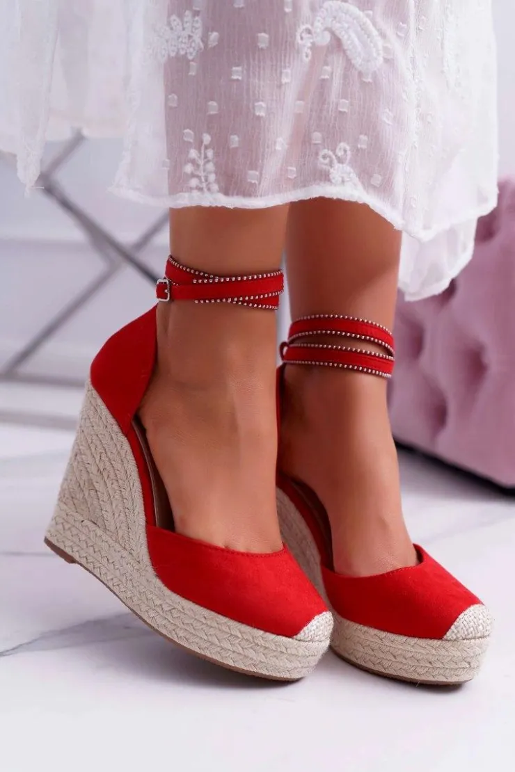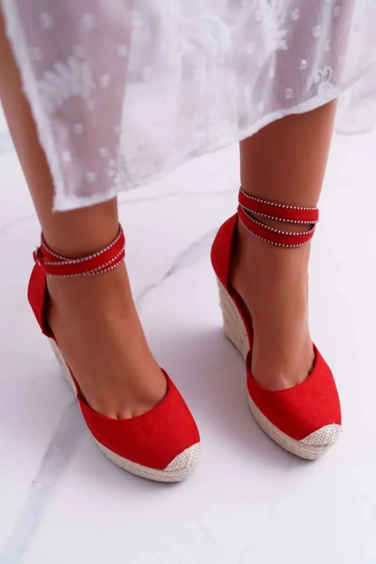 Damskie Boto Sandały Damskie Na Koturnie Lniane Czerwone Canterola