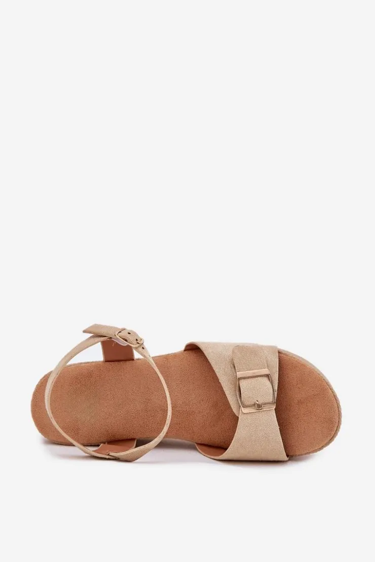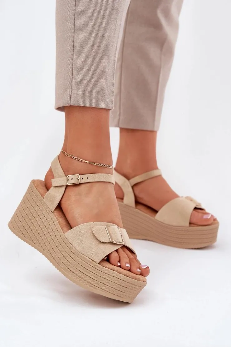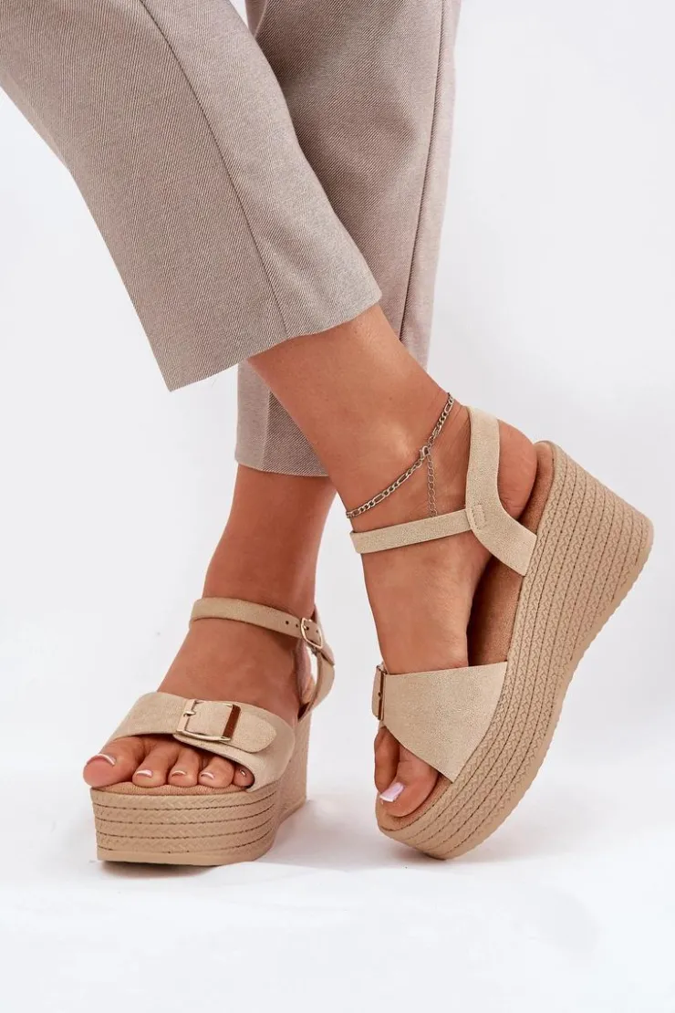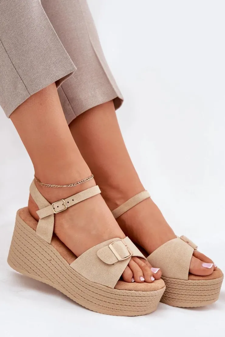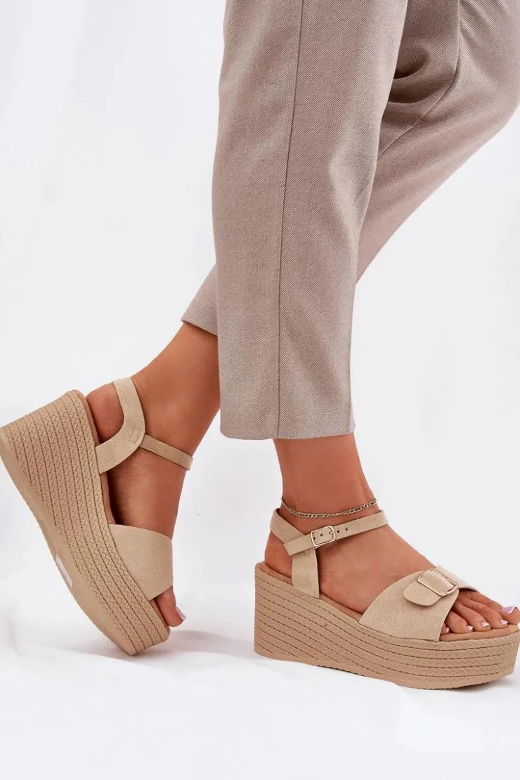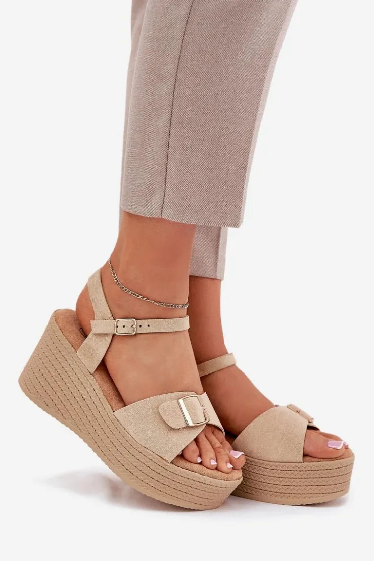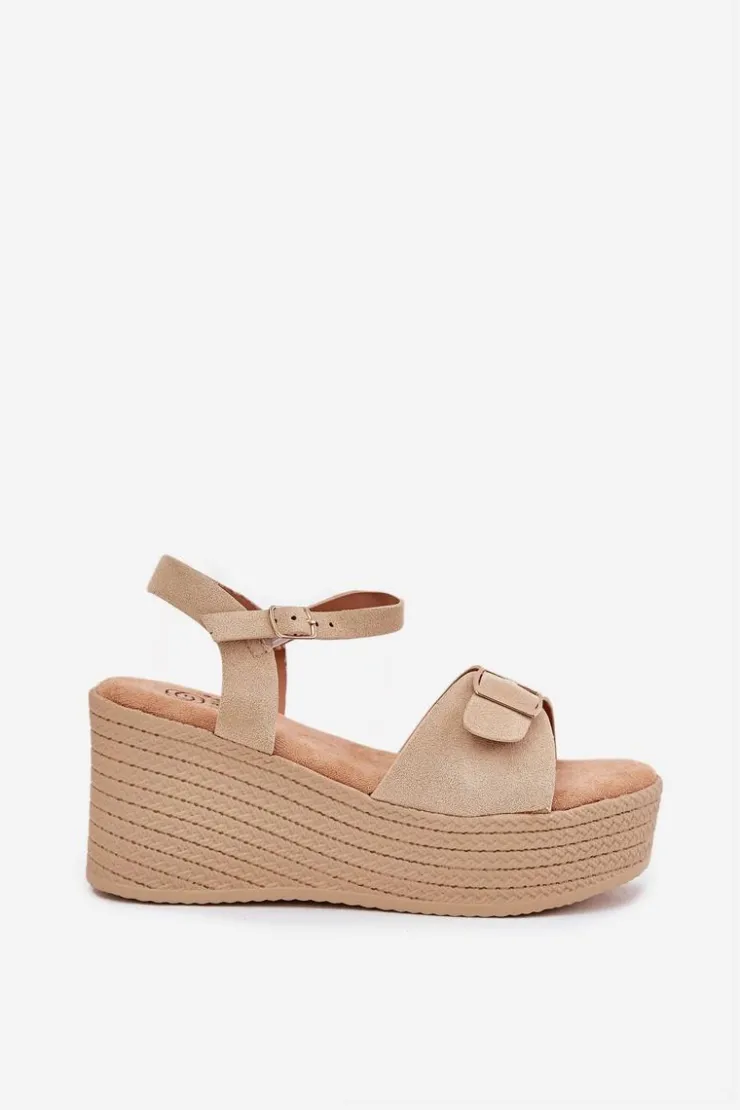 Damskie sandały wykonane z eko zamszu. Osadzone na koturnie i platformie z imitacją plecionki, zapewniają wygodę oraz stabilność przez cały dzień. Z przodu znajdują się ozdobna klamra, która dodaje im unikalnego charakteru. Model zapinany na sprzączkę umożliwia idealne dopasowanie do stopy, a miękka wkładka gwarantuje komfort. Te sandały będą doskonałym uzupełnieniem letnich stylizacji. Przy wyborze rozmiaru prosimy sugerować się tabelą rozmiarów.