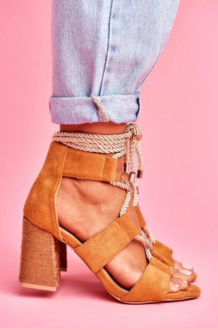 Damskie Boto Sandały Damskie Na Słupku Wiązane Zamszowe Camel Amore