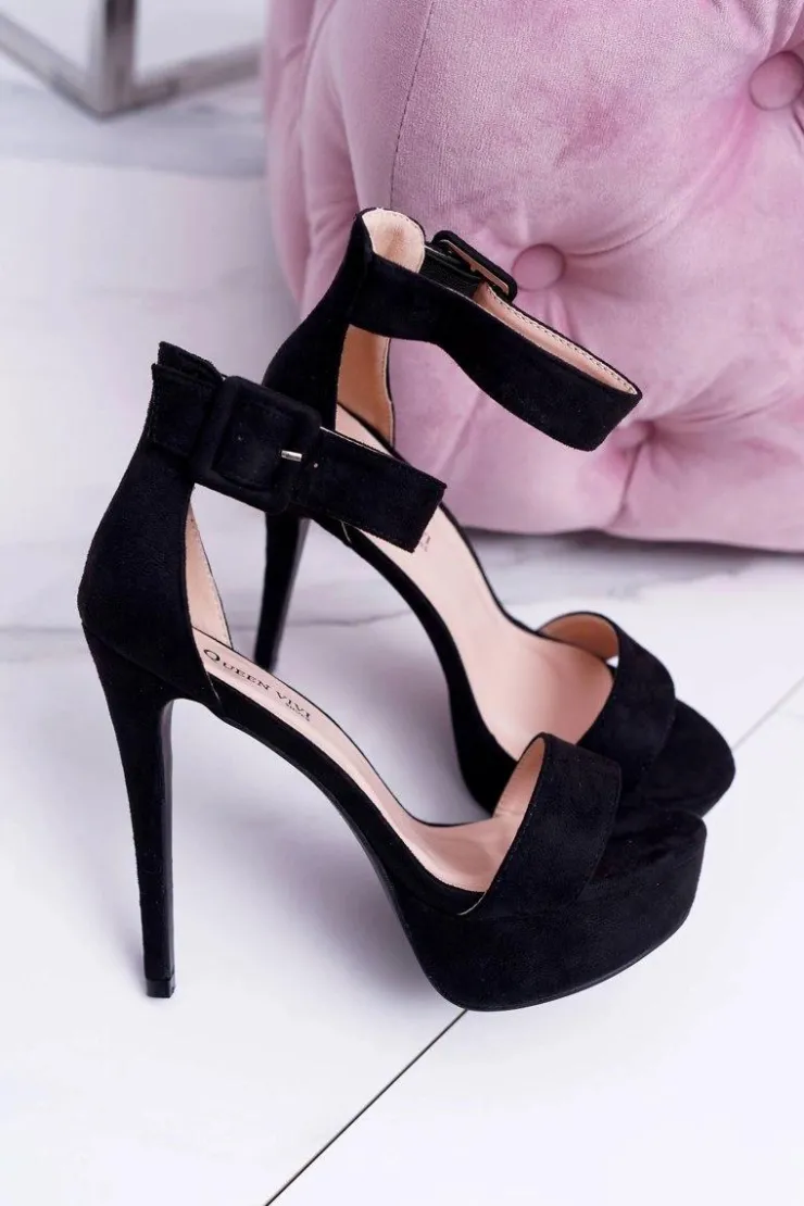 Wygodne, wysokie zamszowe sandały to marzenie każdej kobiety! Wysoka oraz stabilna szpilka zapewni Ci gwarancję dobrego samopoczucia oraz gustownego wyglądu. Ekozamsz z którego zostały wykonane z pewnością sprawi, że zostaniesz zauważona! Model klasycznie zapinany delikatnym paskiem. Wysoka platforma pod palcami przyciągnie spojrzenia innych osób!