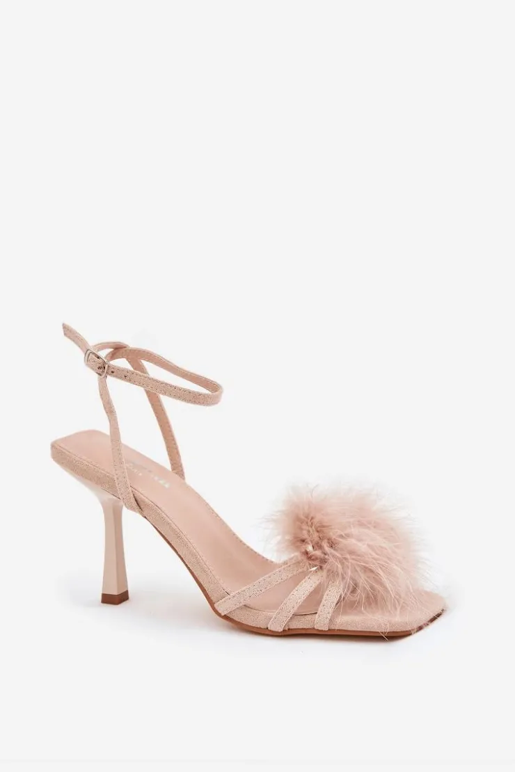 Eleganckie damskie sandały z eko zamszu, doskonałe na specjalne okazje. Osadzone na szykownej szpilce, wyróżniają się subtelną ozdobą z piór z przodu, co nadaje im lekkości i wyrafinowanego charakteru. Regulowany pasek ze sprzączką umożliwia idealne dopasowanie do stopy. To unikalny wybór, który doskonale dopełni wieczorowe i koktajlowe kreacje, przyciągając wzrok swoim niepowtarzalnym wyglądem. Przy wyborze rozmiaru prosimy sugerować się tabelą rozmiarów.