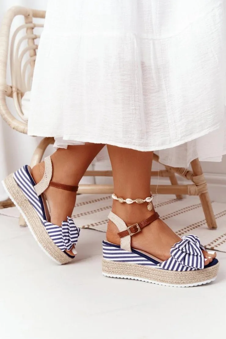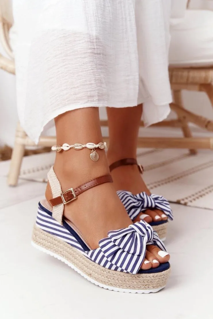Piękne oraz wygodne sandały na koturnie wykonane z połączenia eko skóry, oraz tkaniny. Buty posiadają miękką wkładkę ze skóry ekologicznej. Modny fason w marynarskim stylu urozmaici Twoją letnią garderobę! Koniecznie sprawdź całą naszą kolekcję damskich sandałów. Przy wyborze rozmiaru prosimy sugerować się tabelą rozmiarów.