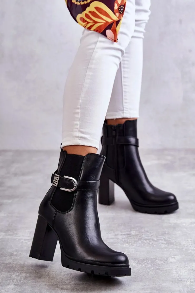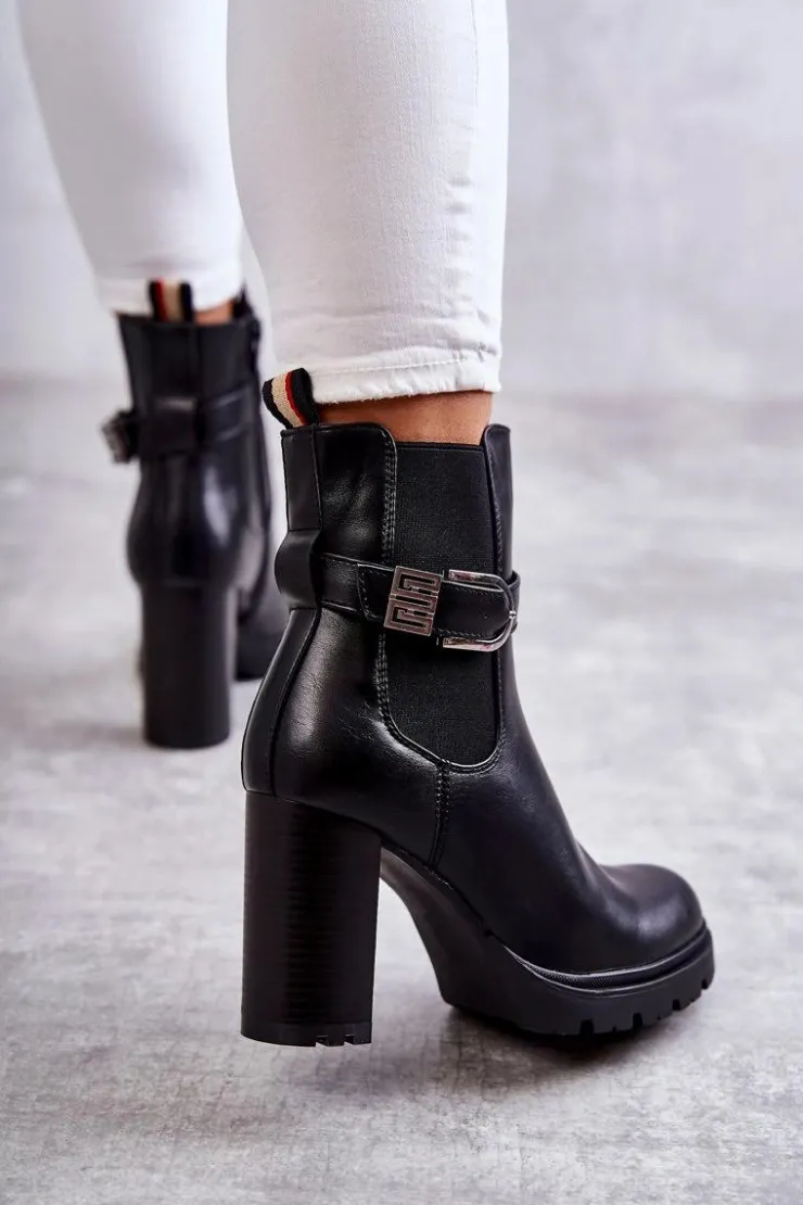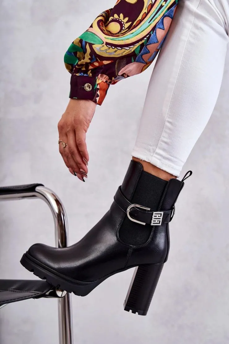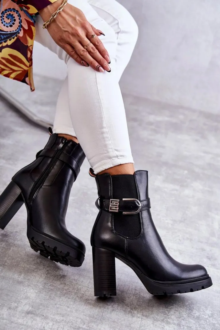 Spójrz tylko na te botki! Klasyka z elegancją w jednym! Botki zostały wykonane ze skóry ekologicznej. Posiadają z boku cholewki regulowany pasek oraz ozdobę. Botki zostały osadzone na obcasie w postaci słupka oraz platformie ze żłobieniami. Po wewnętrznej stronie znajduje się suwak ułatwiający zakładanie obuwia. Zapiętek jest usztywniany. Środek botków został ocieplony kocem obuwniczym. Przy wyborze rozmiaru prosimy sugerować się tabelą rozmiarów.