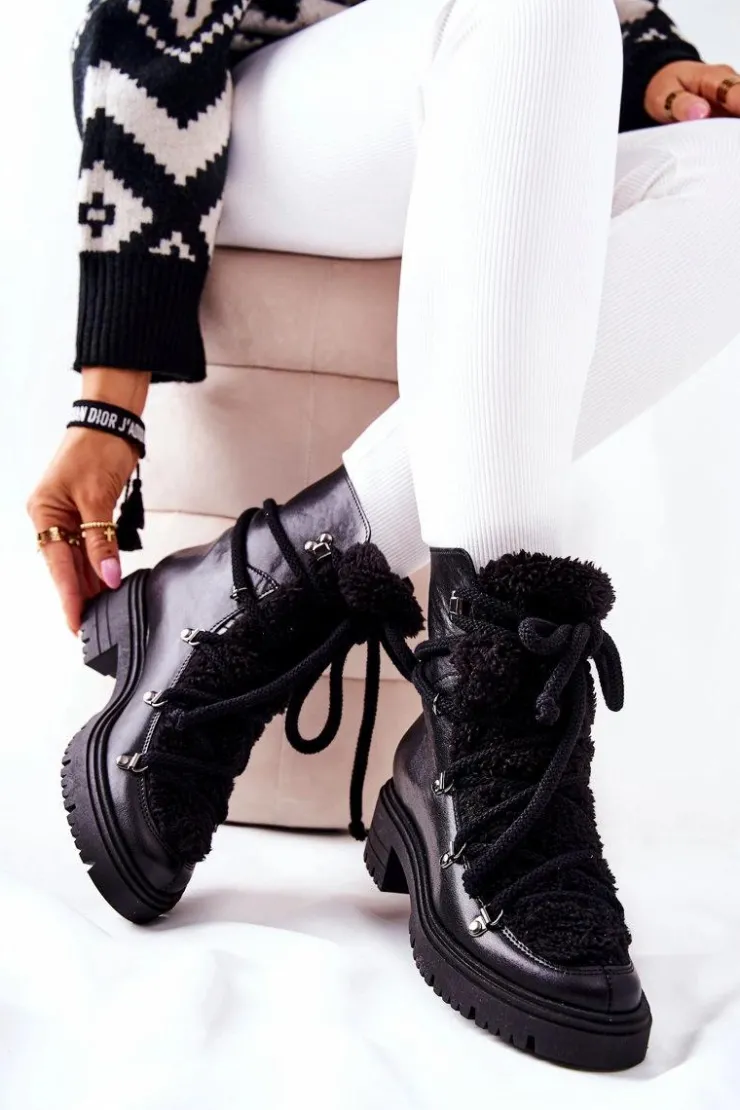 Ten model wprawia w zachwyt każdego, kto uwielbia wyróżniać się z tłumu! Ocieplany język botków, który został wykonany z przyjemnego w dotyku kożuszka sprawia, że trapery są niezwykle wyjątkowe! Zostały wykonane z naturalnej licowej skóry. Wkładka jest także skórzana. Posiadają wiązanie, które można dopasować do tęgości nogi. Buty osadzone są na płaskim obcasie i delikatnej platformie. Koniecznie musisz je mieć! Przy wyborze rozmiaru prosimy sugerować się tabelą rozmiarów.