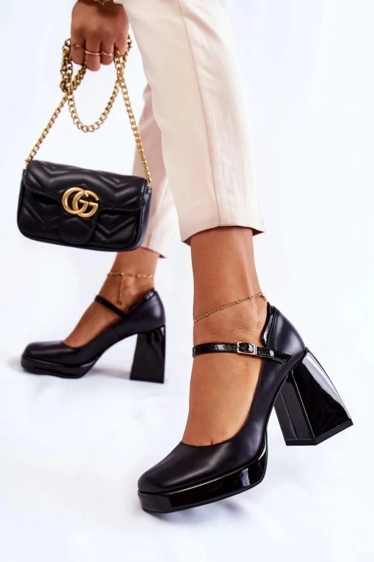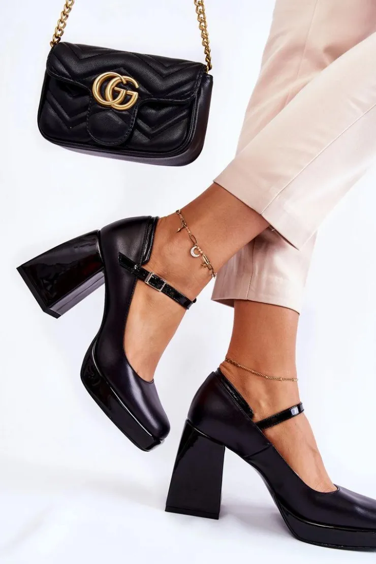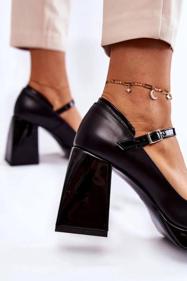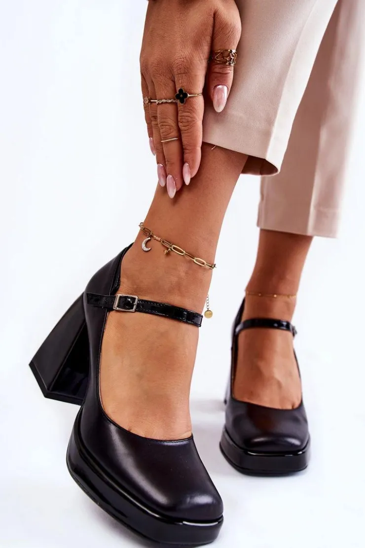 Wyjątkowe czółenka wykonane z wysokiej jakości naturalnej skóry. Posiadają regulowany pasek zapinany na sprzączkę. Osadzone na masywnym, wyższym obcasie w postaci klocka. Zapiętek jest usztywniany, a nosek kwadratowy. Miękka wkładka zapewnia wygodę podczas użytkowania. Dodatkowo buty posiadają delikatną platformę. Świetny model na różnego rodzaju uroczystości. Przy wyborze rozmiaru prosimy sugerować się tabelą rozmiarów.