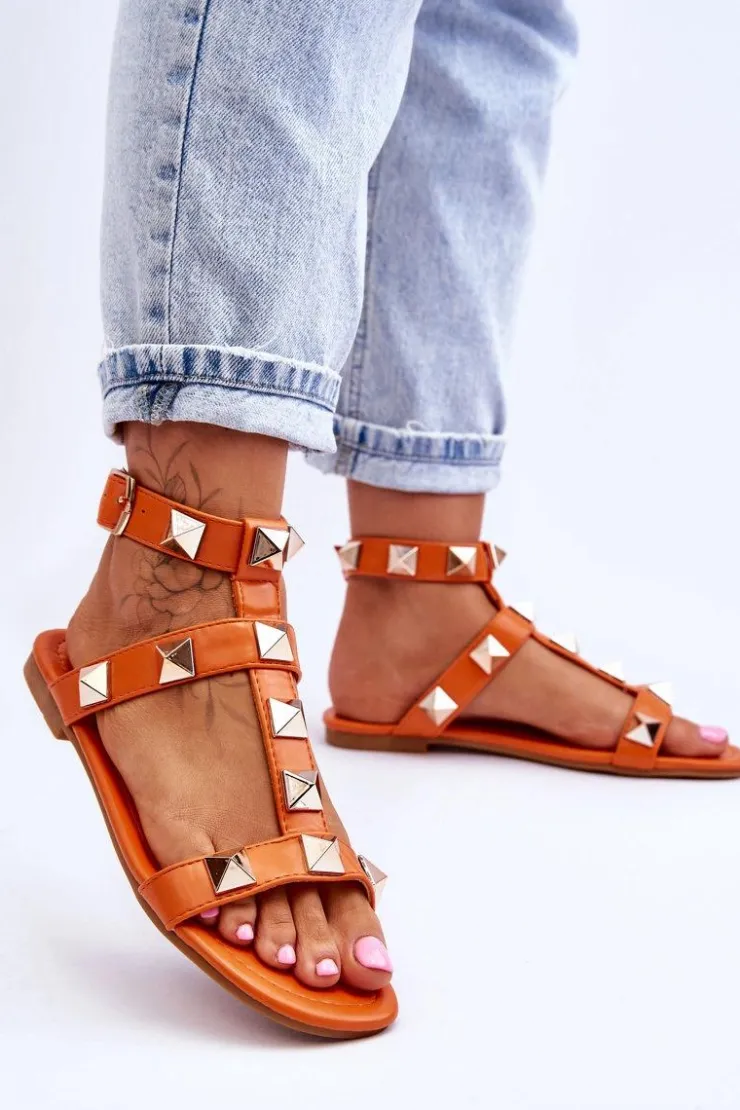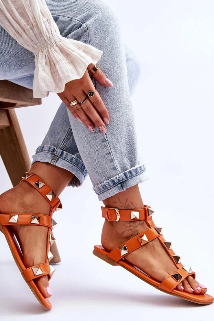 Damskie sandały zostały wykonane z eko skóry. Posiadają zapinanie w postaci regulowanego paska z klamrą. Dodatkowo zostały ozdobione dużymi ćwiekami. Sandały posiadają odkryte palce oraz piętę, co sprawia, że są niezwykle przewiewne. Osadzone na płaskim obcasie. Przy wyborze rozmiaru prosimy sugerować się tabelą rozmiarów.