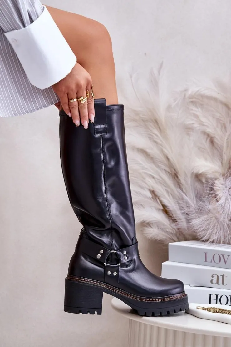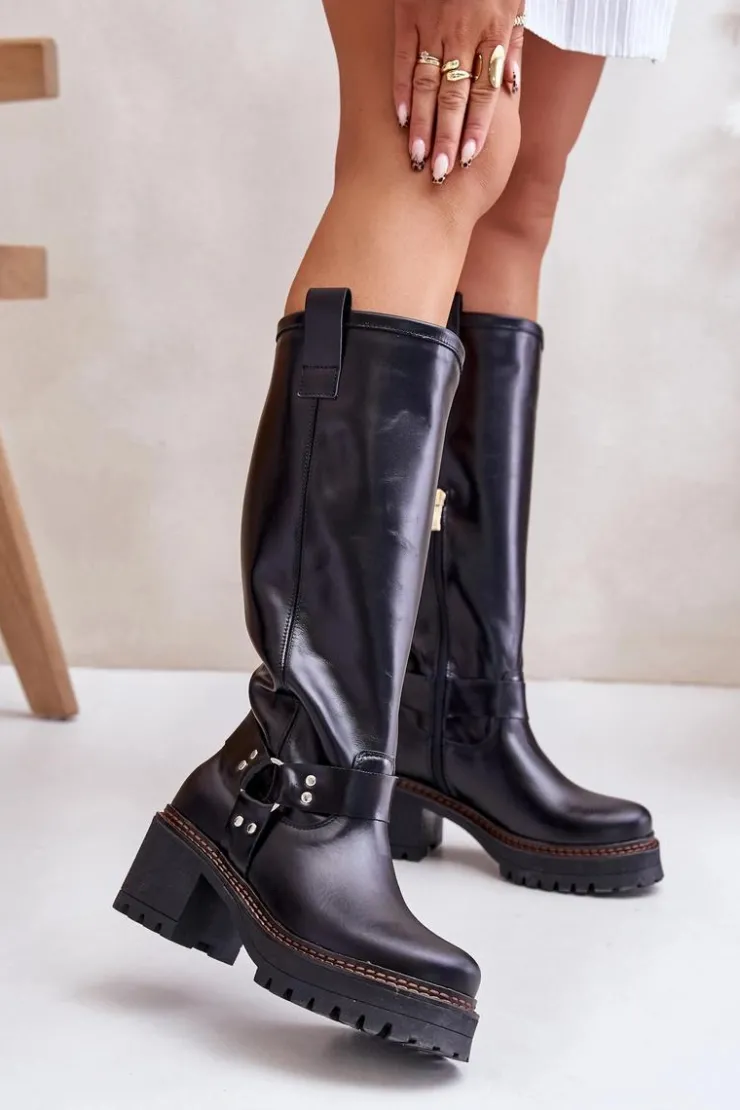 Kozaki damskie wykonane z wysokiej jakości skóry naturalnej. Osadzone na masywnym obcasie i platformie, co zapewni stabilność na każdym kroku. Noski zaokrąglone. Model wsuwany oraz dodatkowo posiada zapięcie na zamek. Nie posiadają ocieplenia. Ten elegancki fason świetnie sprawdzi się w wielu stylizacjach! Przy wyborze rozmiaru prosimy sugerować się tabelą rozmiarów.