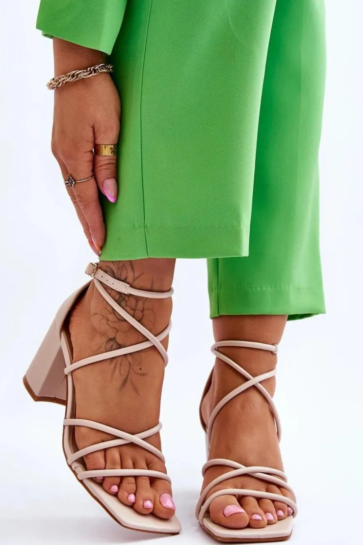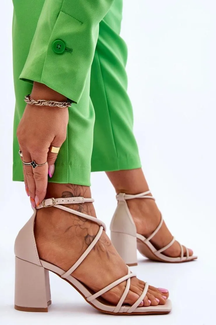 Modne sandałki na masywnym obcasie w postaci słupka zostały wykonane z eko skóry. Model ten posiada regulowany pasek zapinany na sprzączkę. Sandałki posiadają odkryty, kwadratowy nosek. Miękka wkładka została wykonana z eko skóry, co pozwoli na komfortowe użytkowanie obuwia. Idealny model do wielu stylizacji! Przy wyborze rozmiaru prosimy sugerować się tabelą rozmiarów.