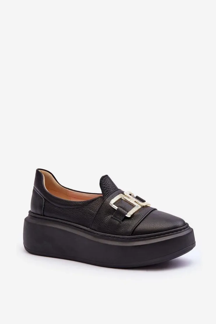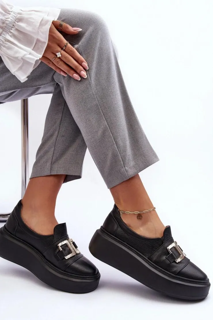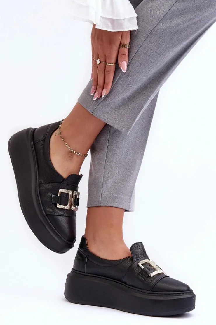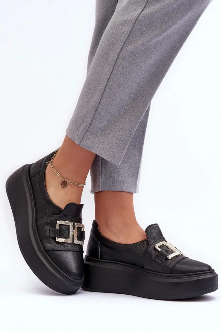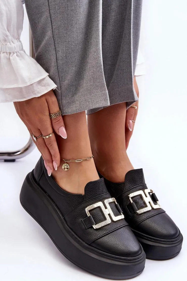 Damskie, wsuwane półbuty zostały wykonane z naturalnej skóry. Z przodu złota ozdoba z tworzywa sztucznego. Model ten osadzony jest na masywnej platformie. Pod językiem znajduje się elastyczna gumka, która pozwoli na odpowiednie dopasowanie obuwia do tęgości nogi. Noski zaokrąglone. Zapiętek usztywniony. Władka wykonana z naturalnej skóry zadba o komfort użytkowania przez cały dzień! Przy wyborze rozmiaru prosimy sugerować się tabelą rozmiarów.
