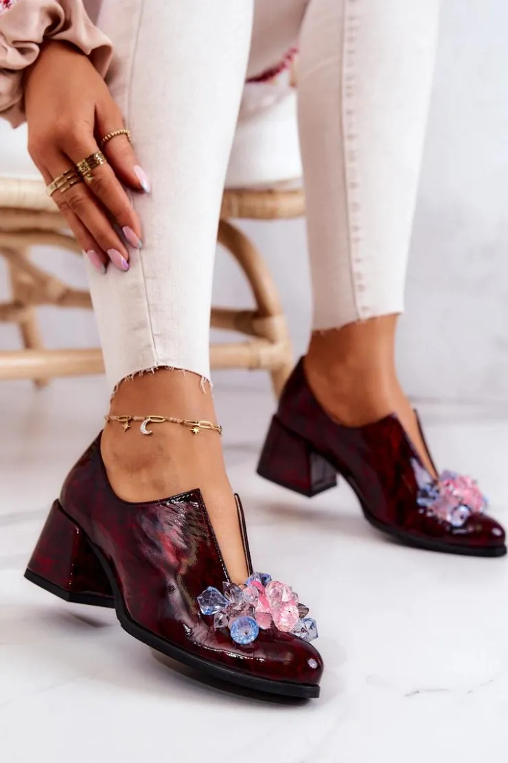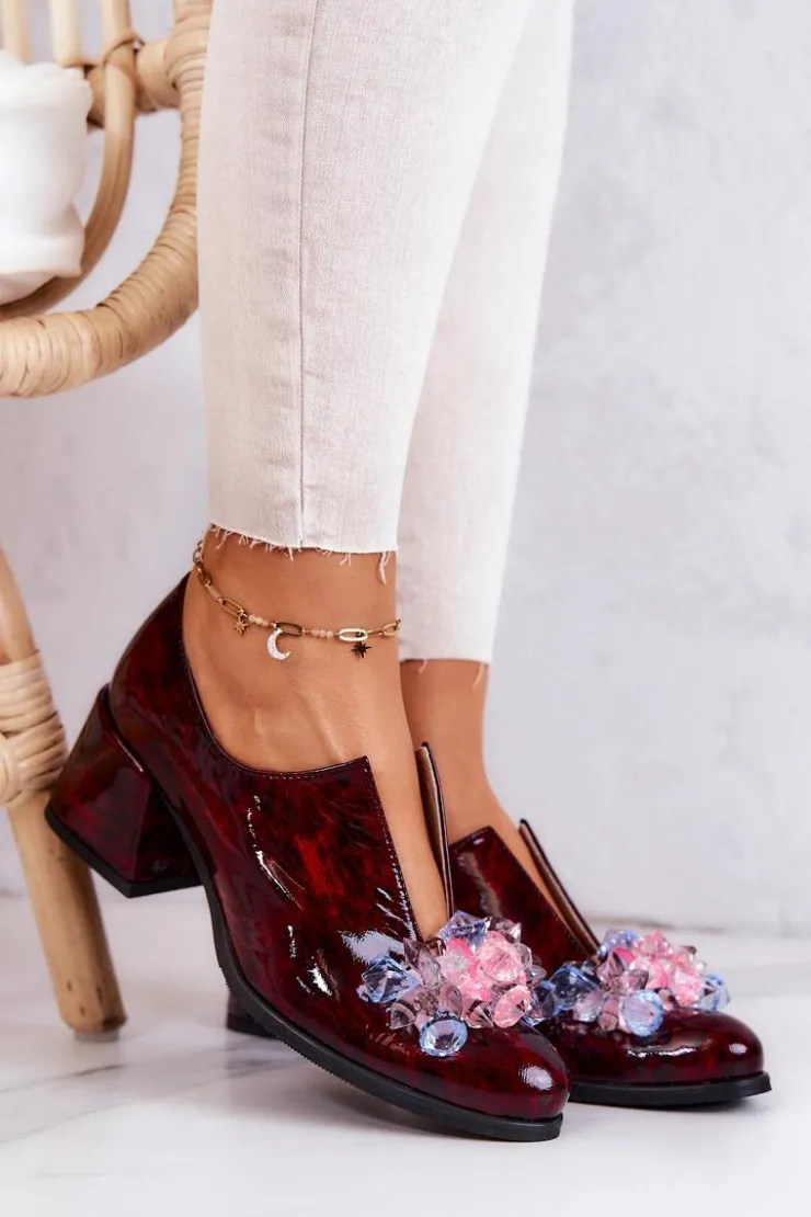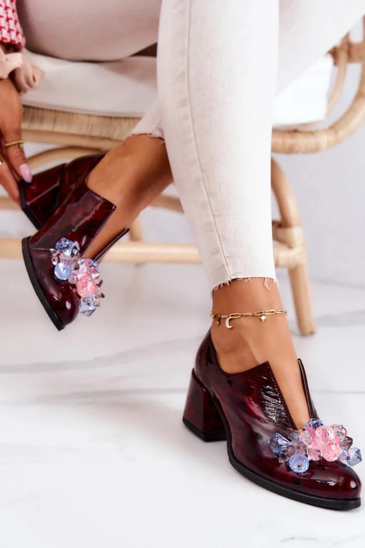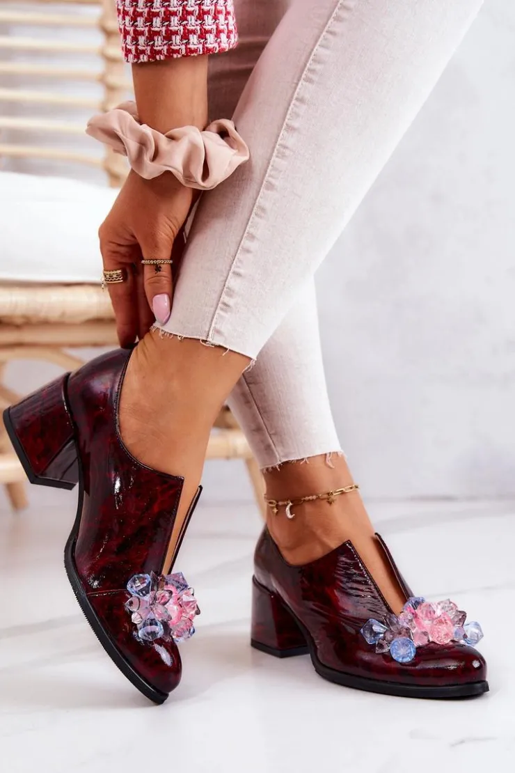 Damskie Boto Skórzane Półbuty Mozaika Z Ozdobą Bordowe Delaver
