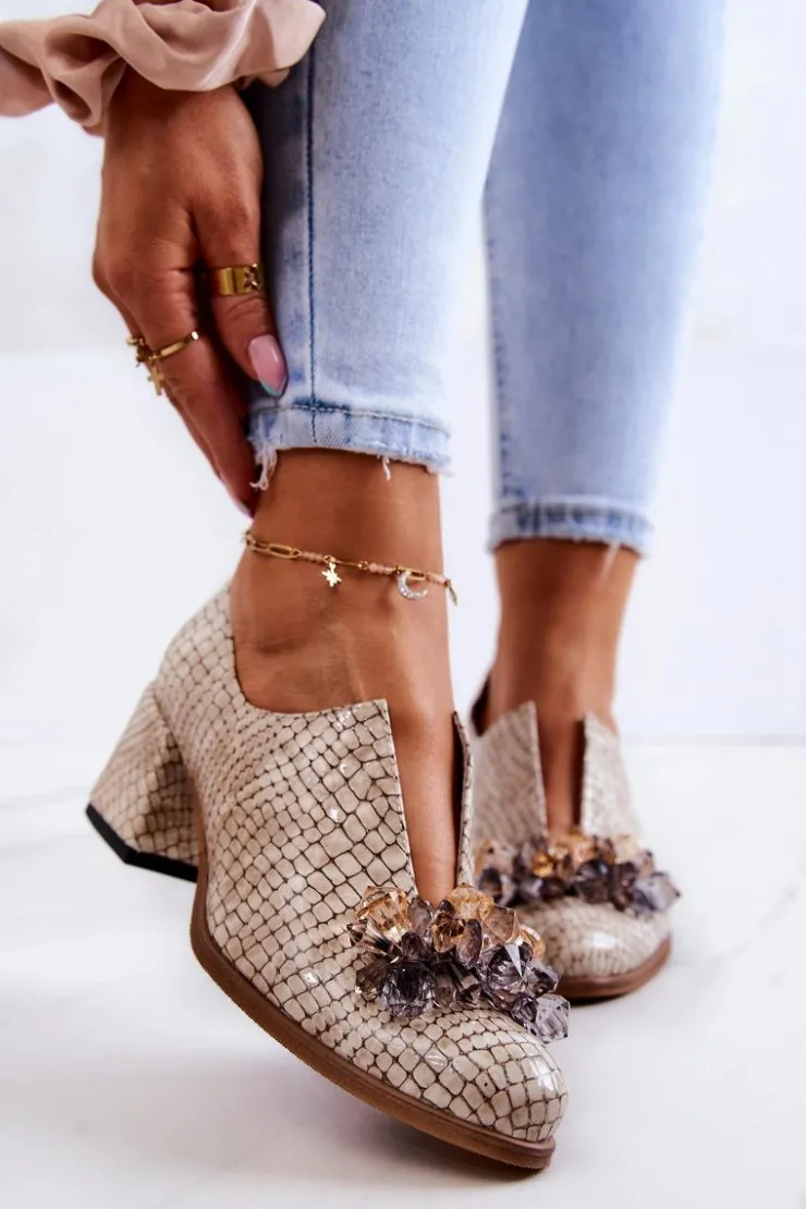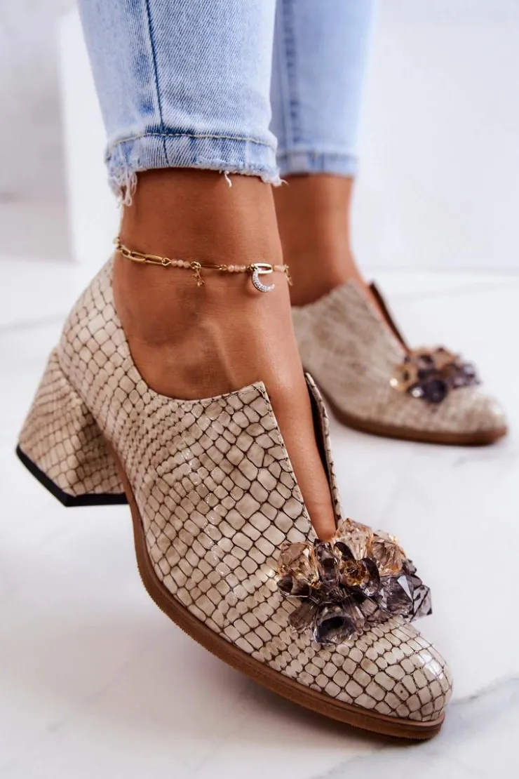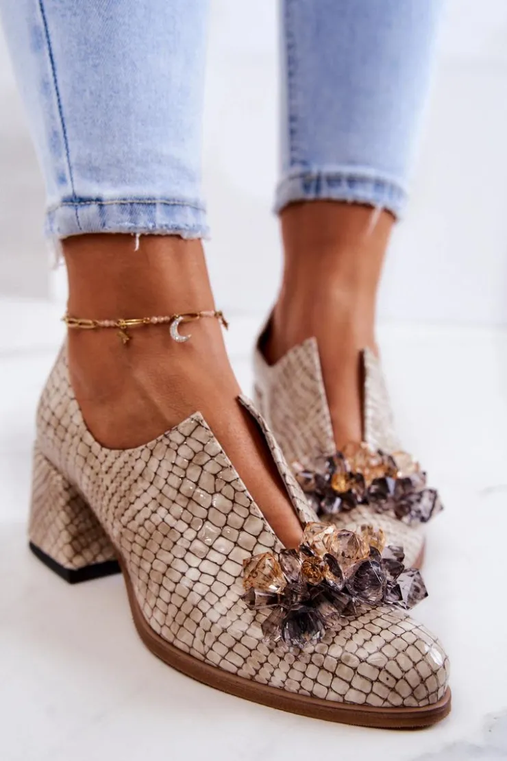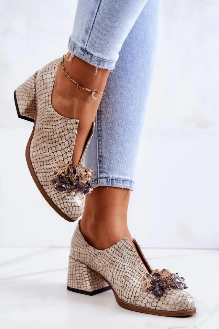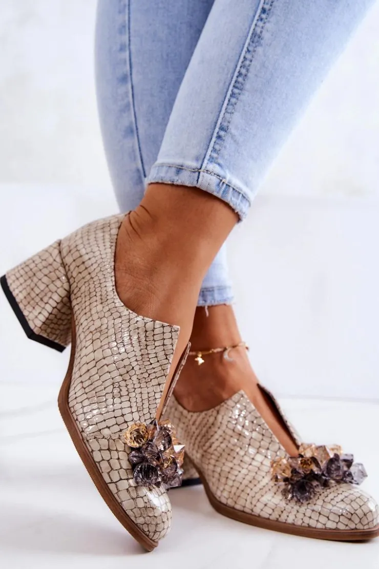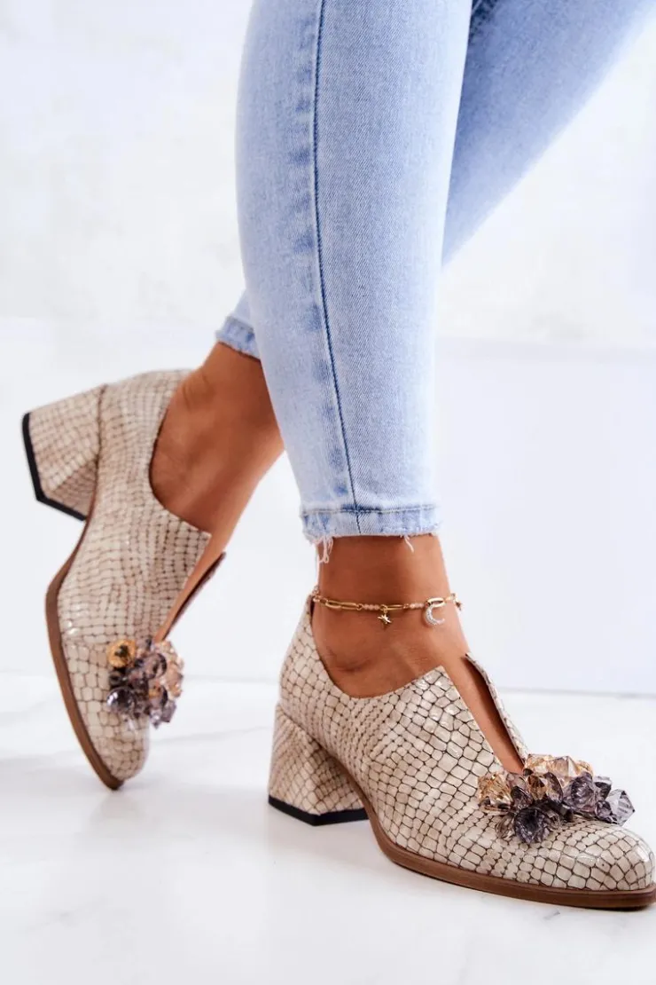 Eleganckie półbuty na niskim obcasie w postaci szerokiego słupka. Zostały wykonane z naturalnej skóry. Posiadają miękką wkładkę. Ozdoba przyszyta na przodzie oraz rozcięcie sprawia, że są naprawdę wyjątkowe. Buty posiadają nosek w kształcie migdała. Koniecznie sprawdź także pozostałe modele półbutów dostępnych w naszej ofercie! Przy wyborze rozmiaru prosimy sugerować się tabelą rozmiarów.