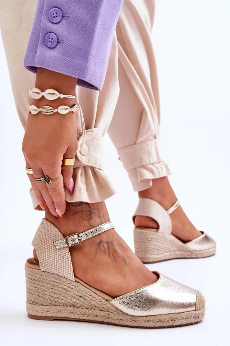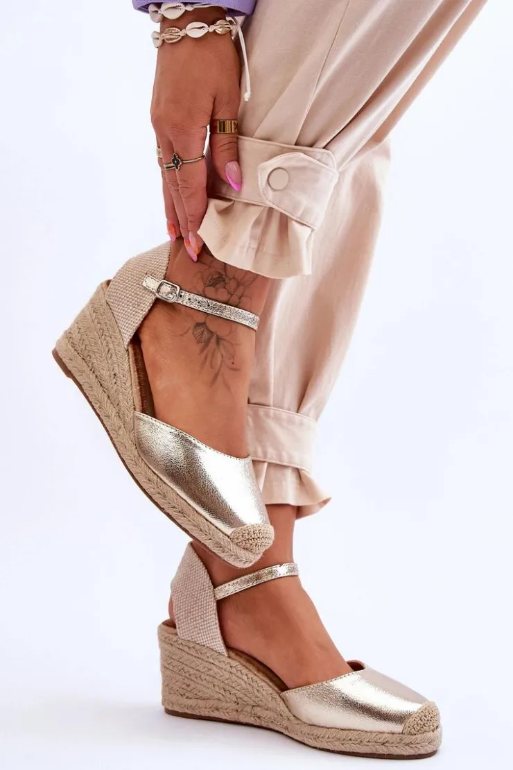 Damskie Boto Skórzane Sandałki Espadryle Na Koturnie Złote Cammer