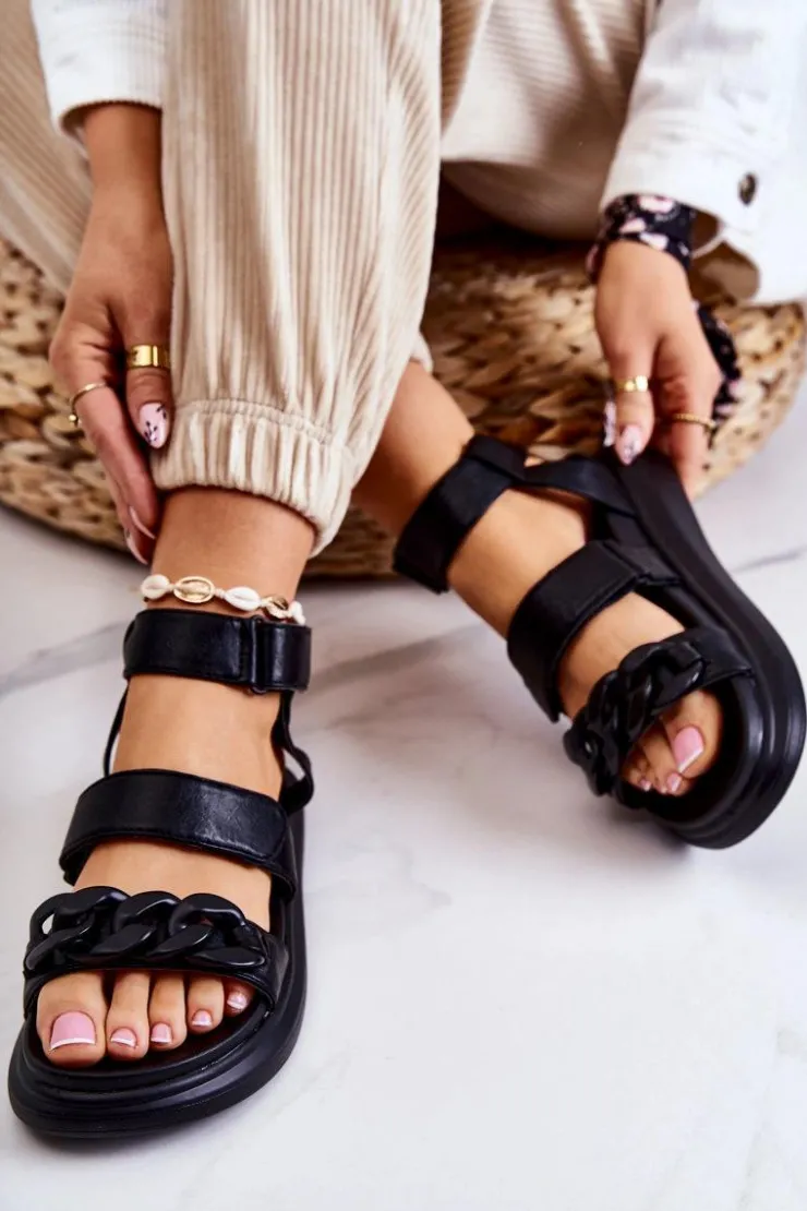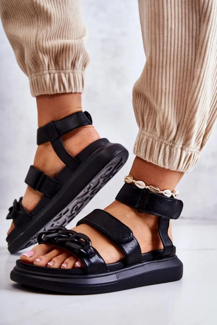 Śliczne sandały damskie od marki La.Fi. Wykonane z wysokiej jakości eko skóry. Paseczki świetnie stabilizują stopę podczas użytkowania. Na przodzie znajduje się ozdobny łańcuch wykonany z tworzywa sztucznego. Paseczki są zapinane na rzepy, więc możesz odpowiednio dopasować buty do tęgości nogi. Osadzone na masywnej platformie wykonanej z tworzywa sztucznego. Idealny model na lato – przewiewny, a zarazem wygodny. Przy wyborze rozmiaru prosimy sugerować się tabelą rozmiarów.