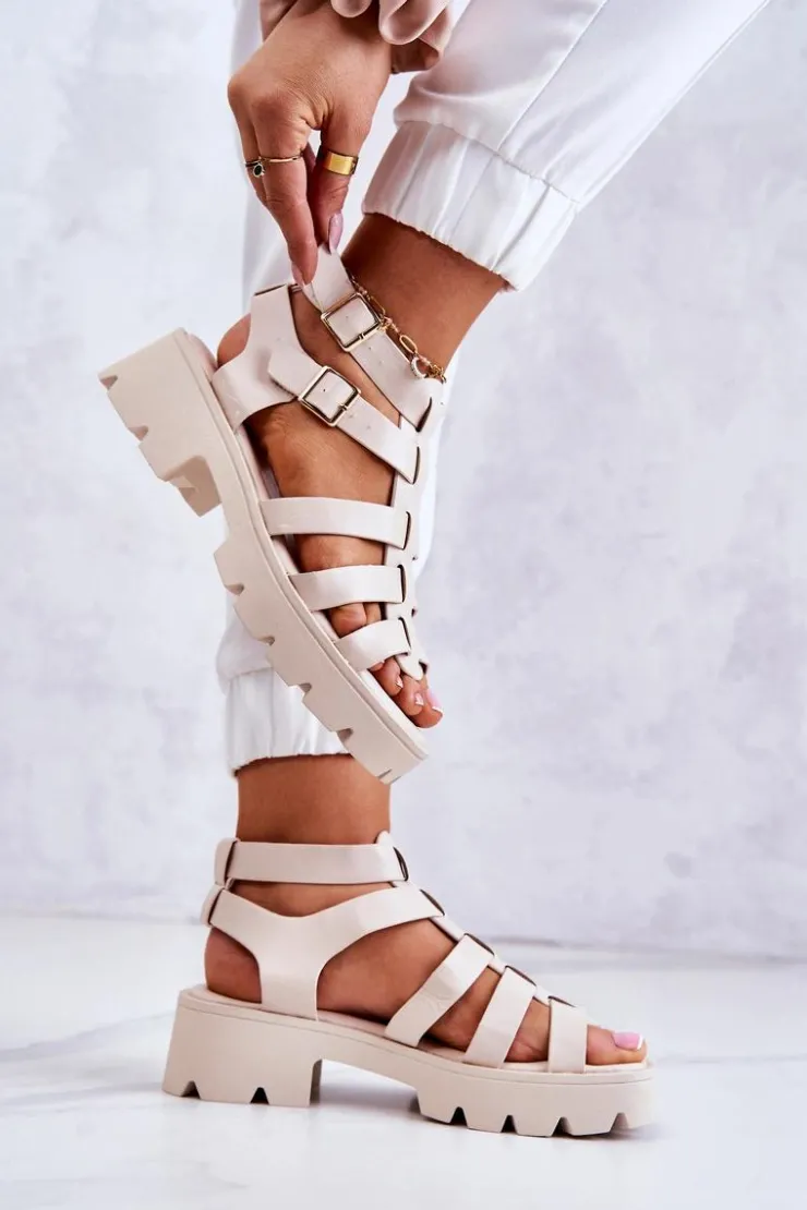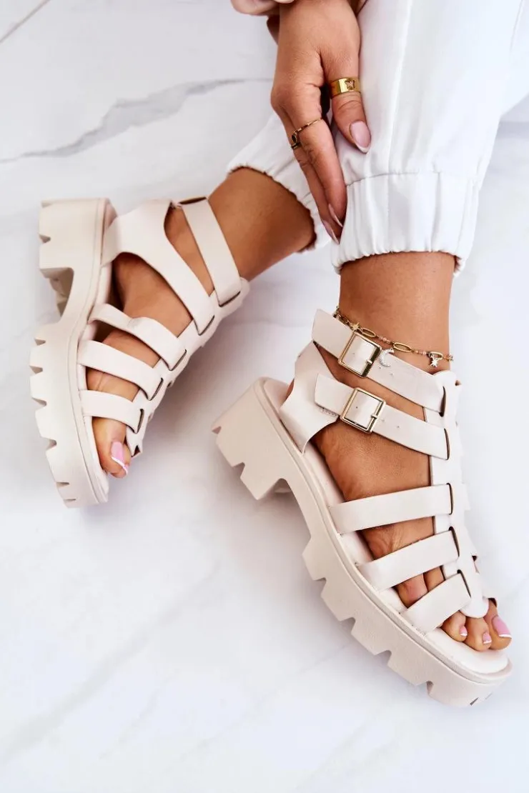 Przewiewne sandały wykonane z eko skóry. Paseczki świetnie podtrzymują stopę. Zapinane na regulowane paski ze sprzączką. Sandałki posiadają odkryty, kwadratowy nosek oraz odkrytą piętę. Miękka, eko skórzana wkładka zapewni wygodę podczas użytkowania. Płaski, masywny obcas oraz platforma sprawiają, że buty są niezwykle stabilne. Te sandałki to idealny fason na upalne dni. Świetnie będą prezentować się z zarówno ze spodniami, jak i sukienkami. Przy wyborze rozmiaru prosimy sugerować się tabelą rozmiarów.