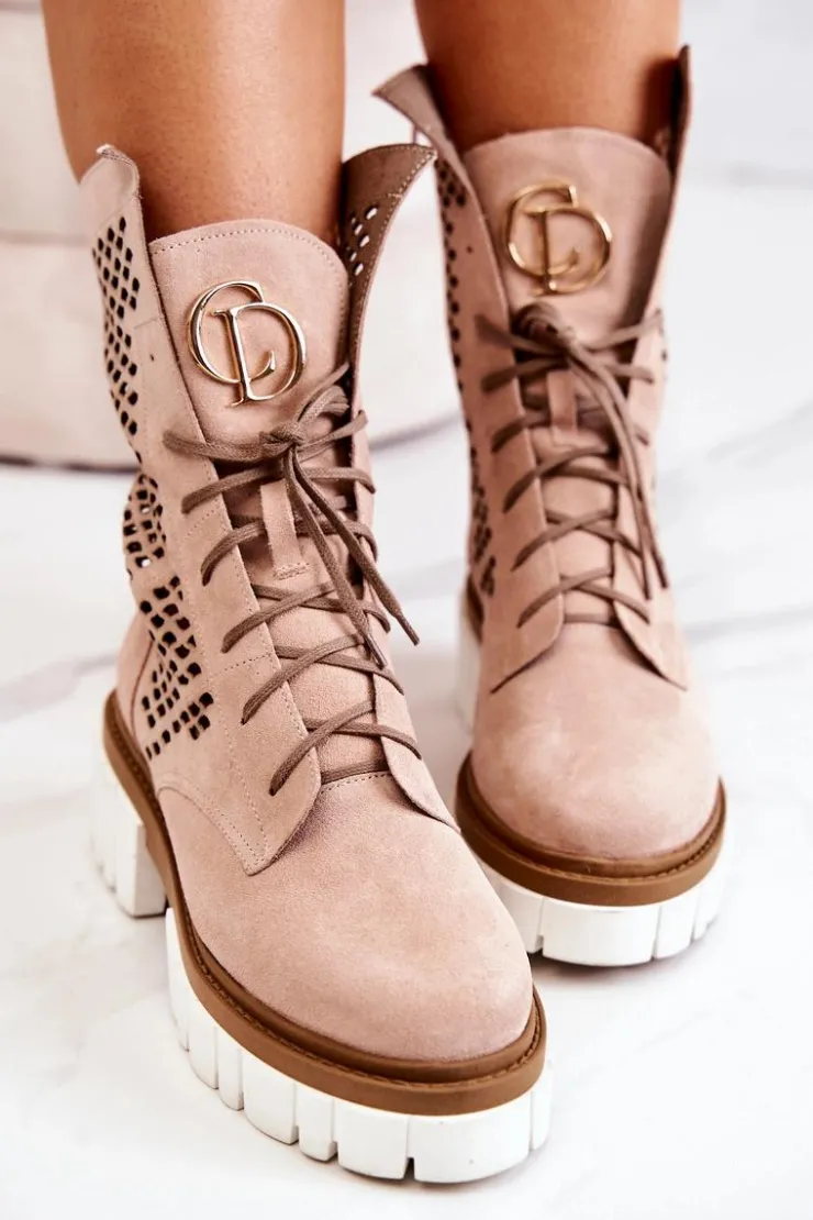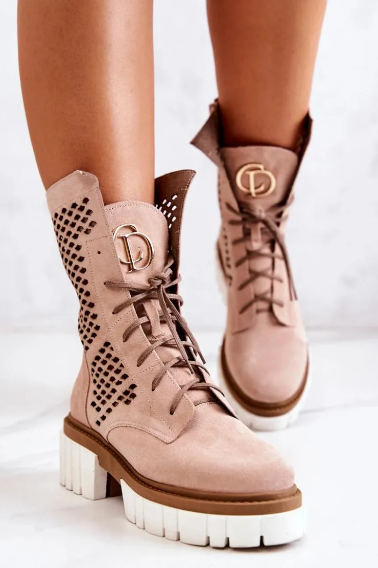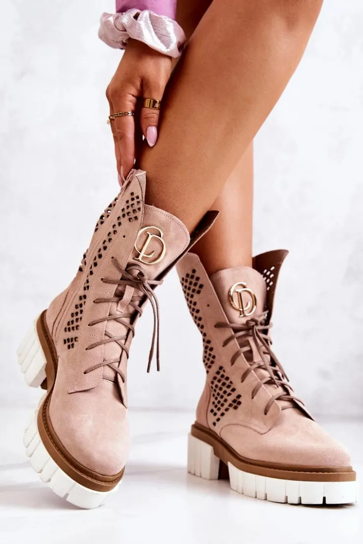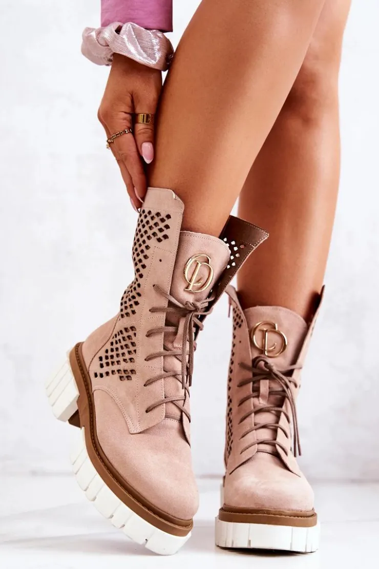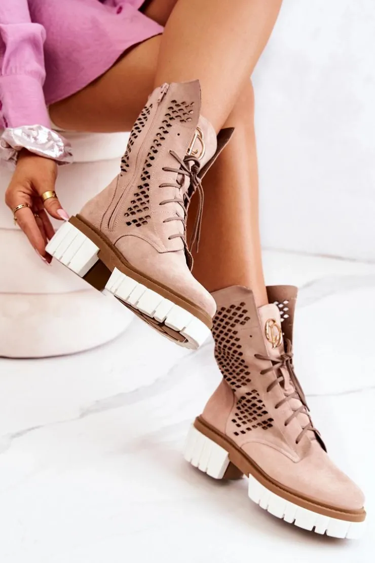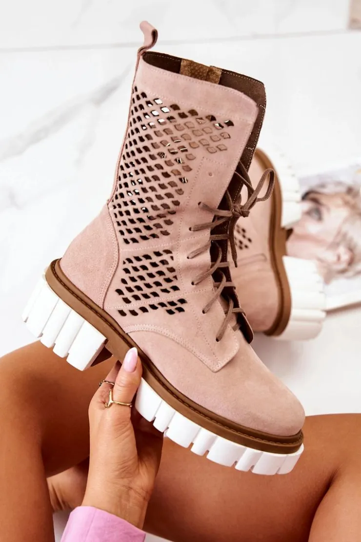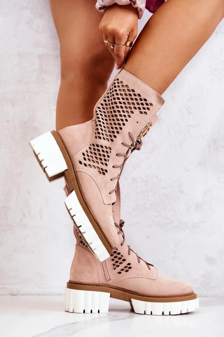Damskie Boto Skórzane Wysokie Botki Workery Nicole Różowe 2706