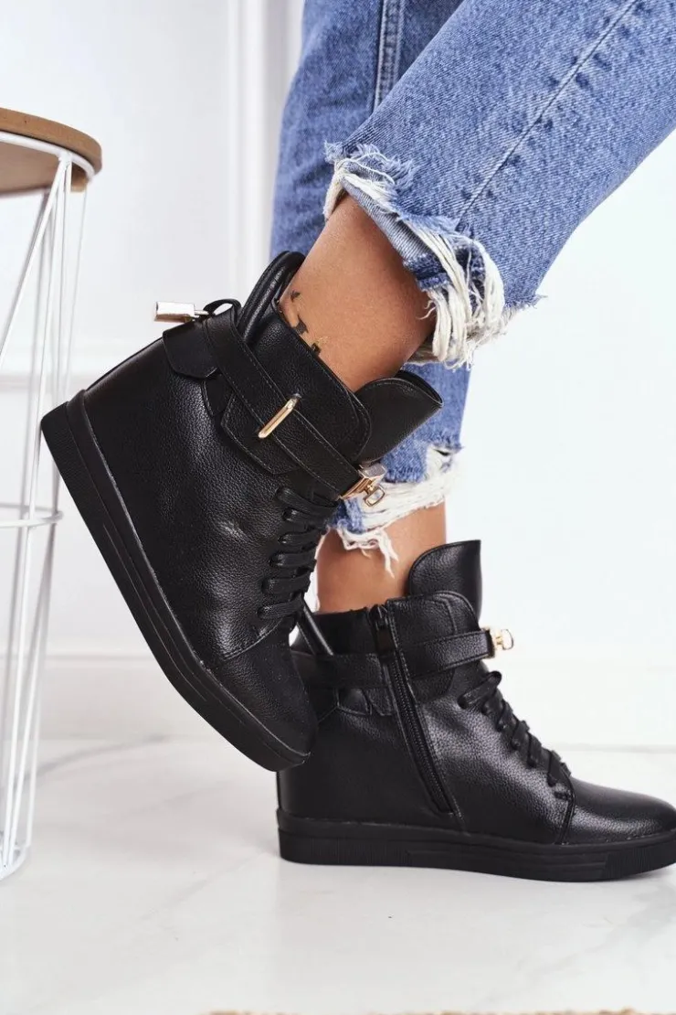 Damskie Boto Sneakersy Damskie Na Koturnie Złota Kłódka Całe Czarne Tersey